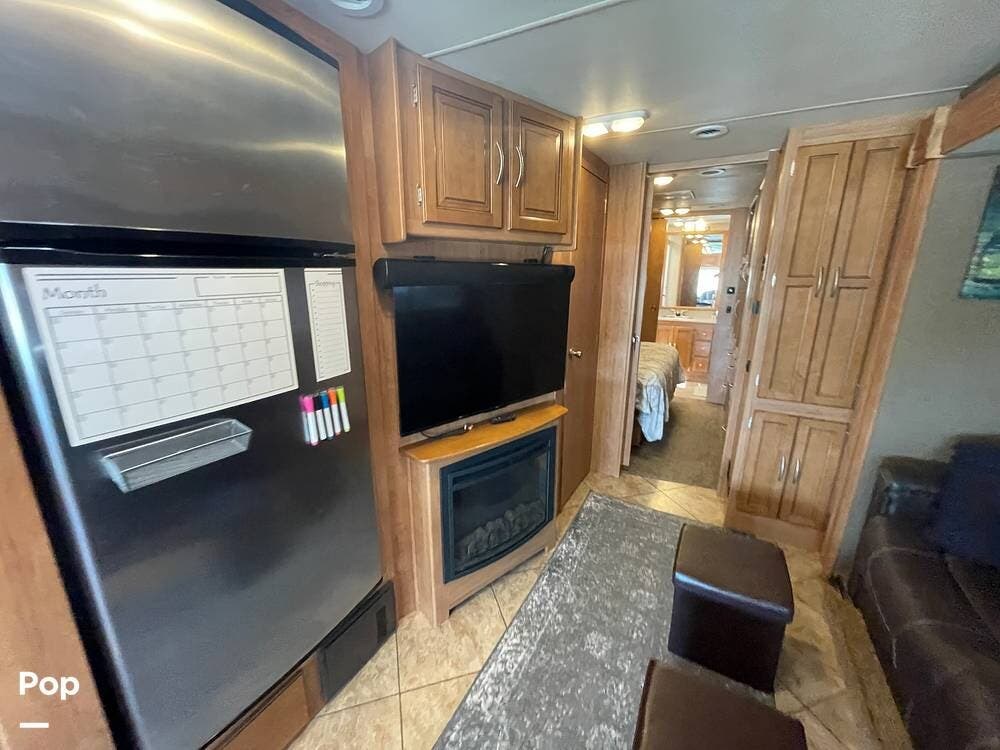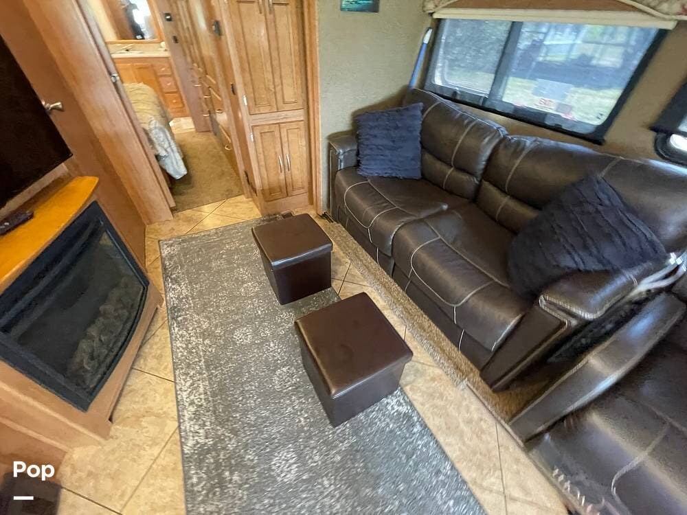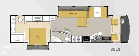 Additional amenities include a fireplace, a large flat-screen TV, automatic leveling jacks, an exterior entertainment center, and a power awning, making the Mirada 35LS a luxurious and practical choice for weekend getaways and extended adventures.