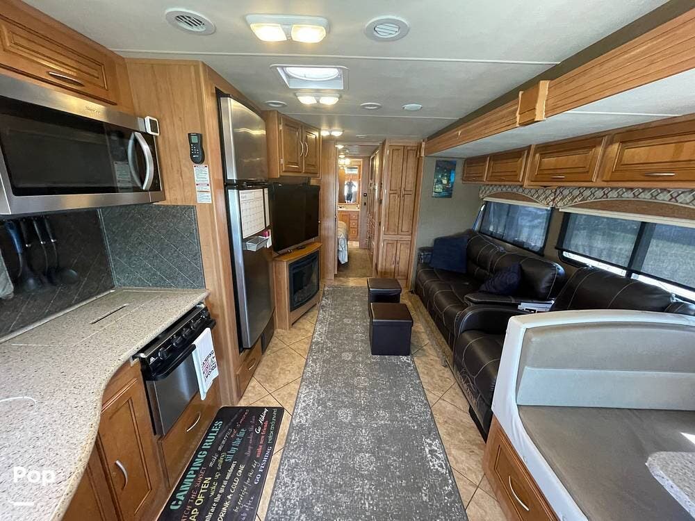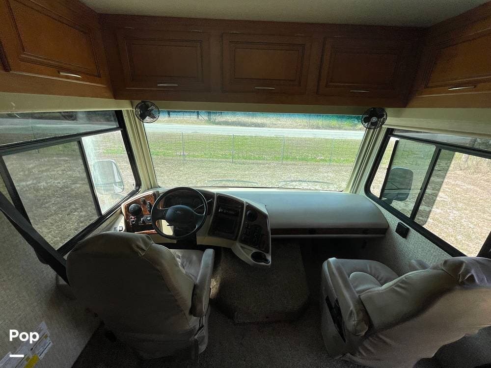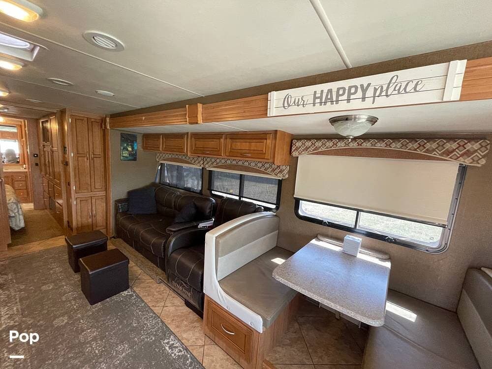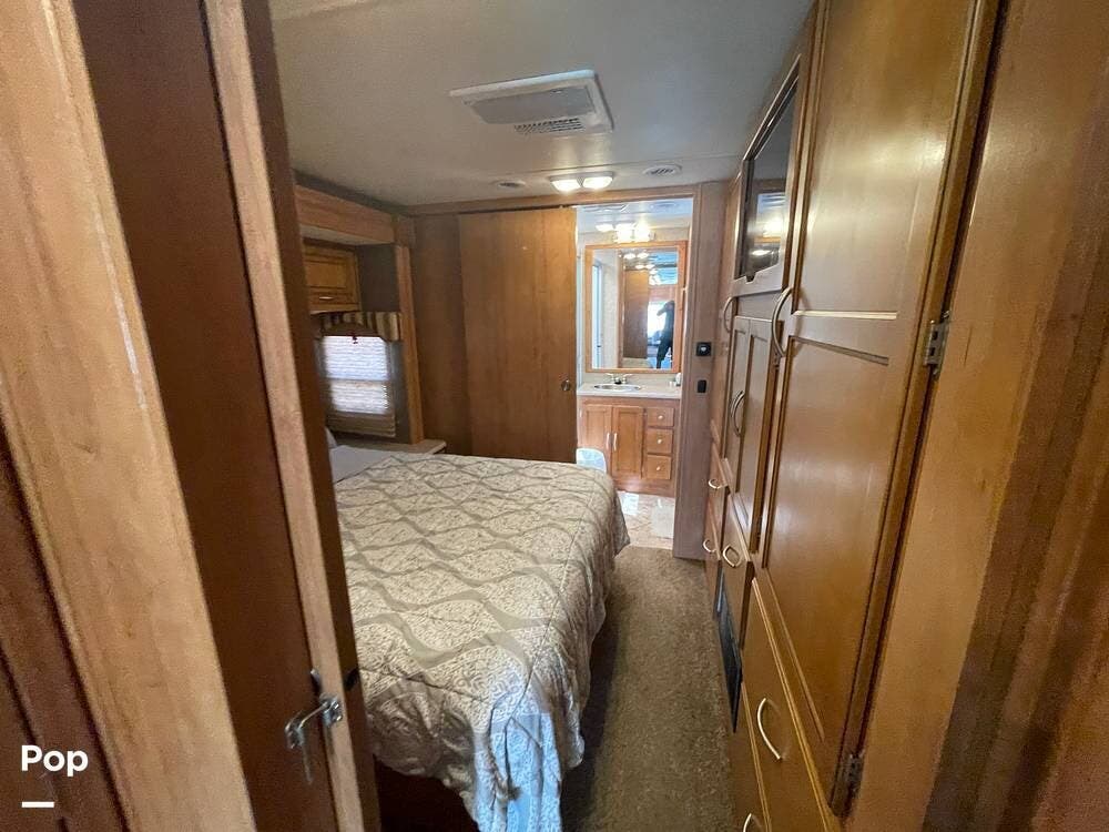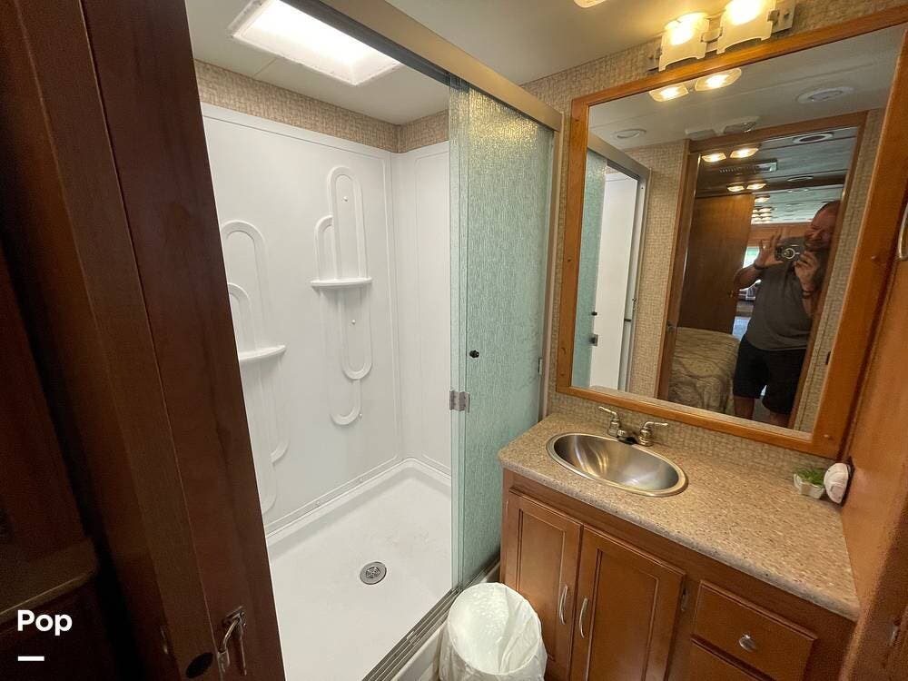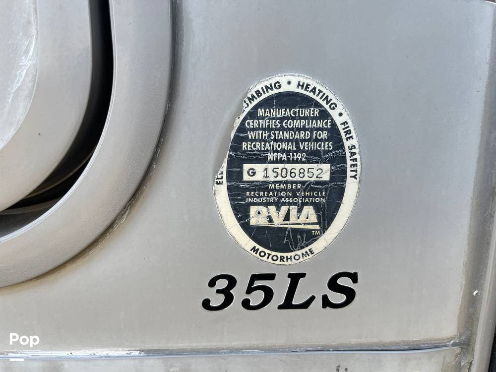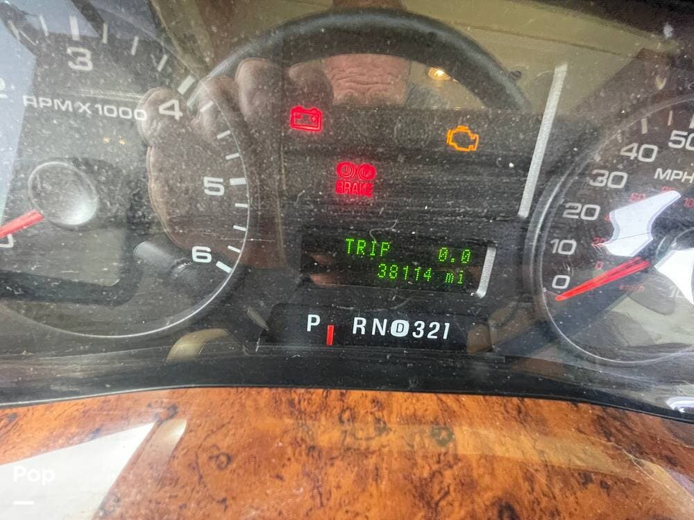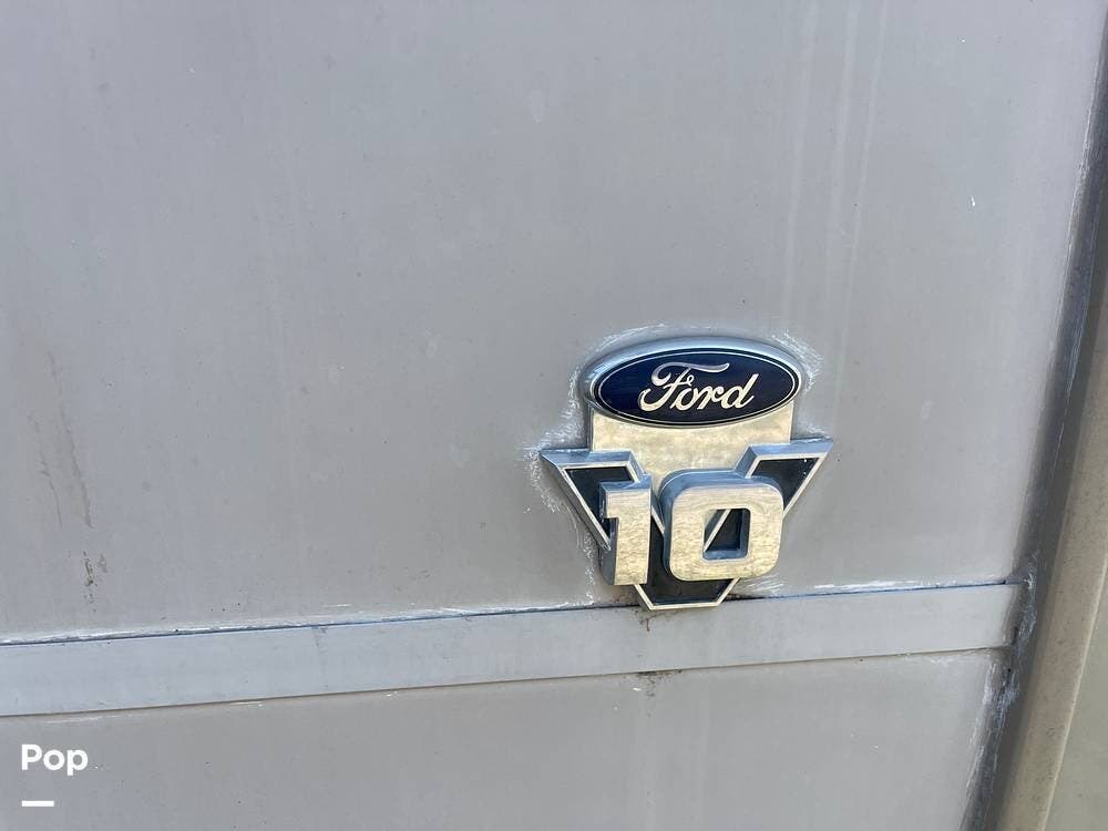 It measures approximately 36 feet in length and features a Ford Triton V10 engine with a 5-speed automatic transmission, providing reliable performance for long trips.