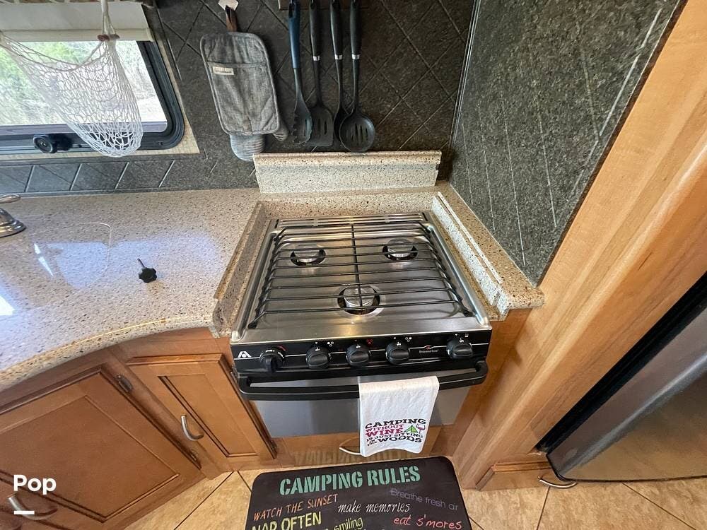 The interior is thoughtfully designed with a dual-slide layout. It offers an open living space with a sofa bed, a booth dinette, and a fully equipped kitchen that includes solid-surface countertops, a three-burner stove, an oven, a microwave, and a residential-style refrigerator.
