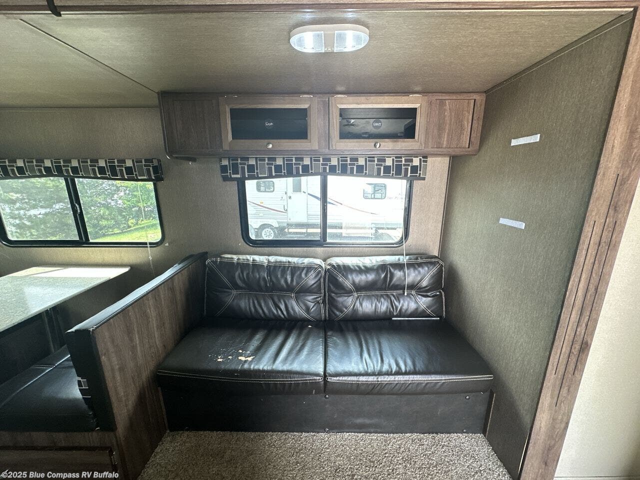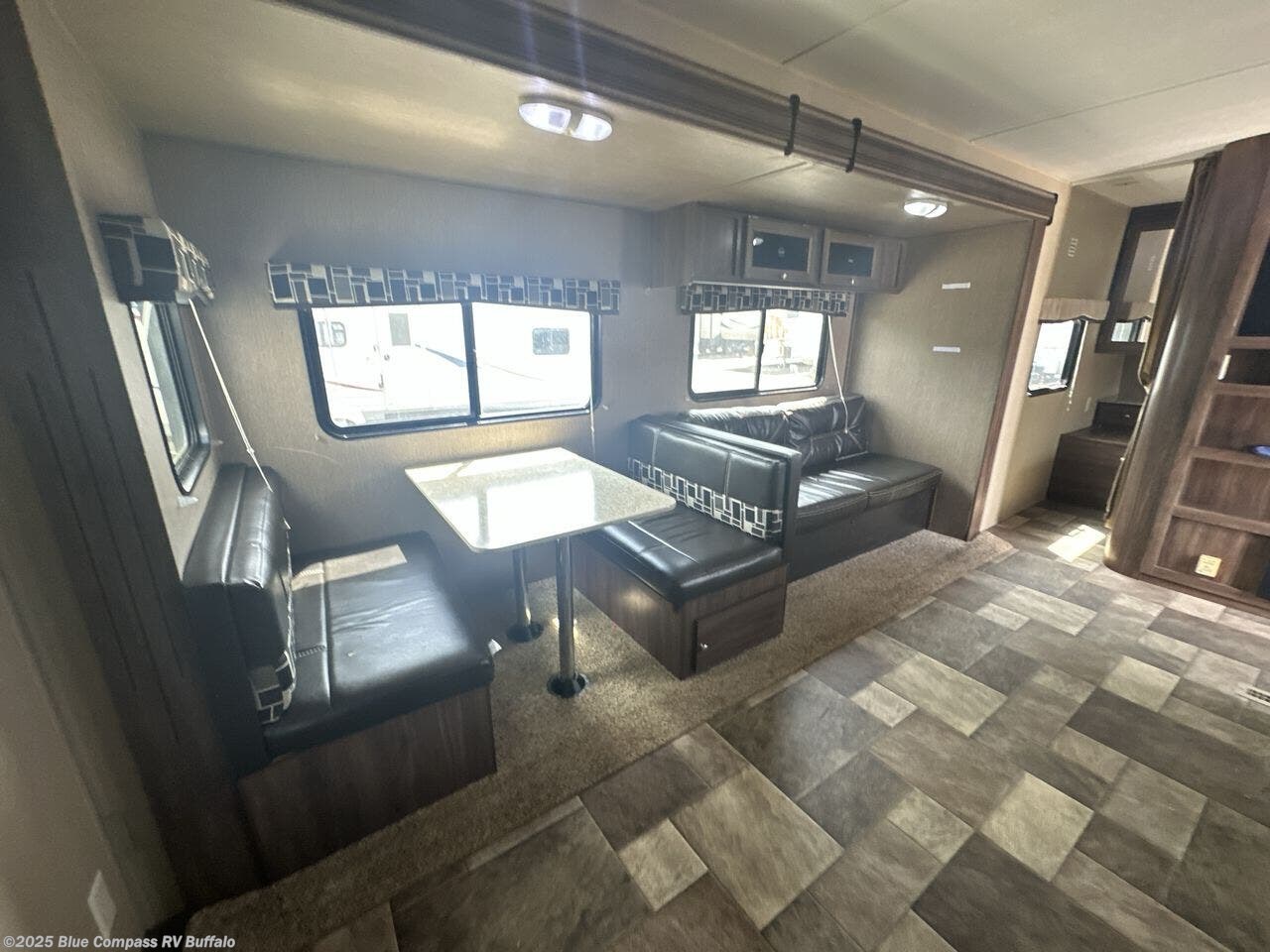 Opposite the door side enjoy relaxing on the sofa or dining at the booth dinette. These are both in a slide out that helps create a bit more walking around space inside.