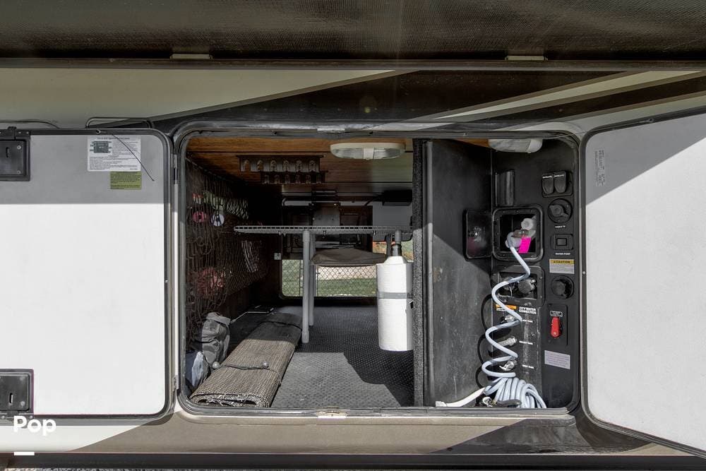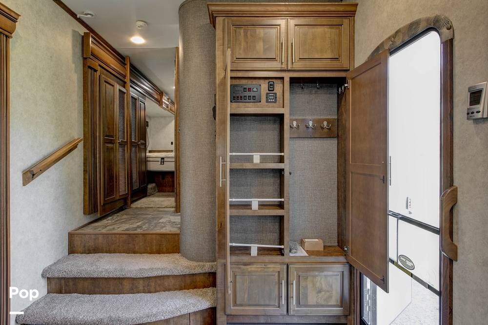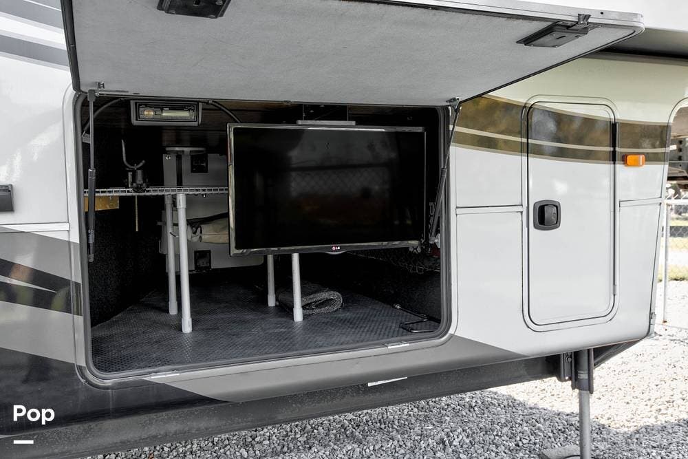The exterior of the RV is just as impressive, with its high-gloss full-body paint, large storage compartments, and a power awning, which provide both aesthetics and functionality. Additional features include self-leveling jacks and an outdoor television.
