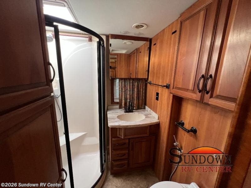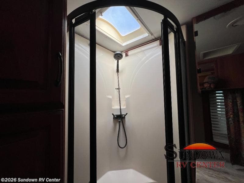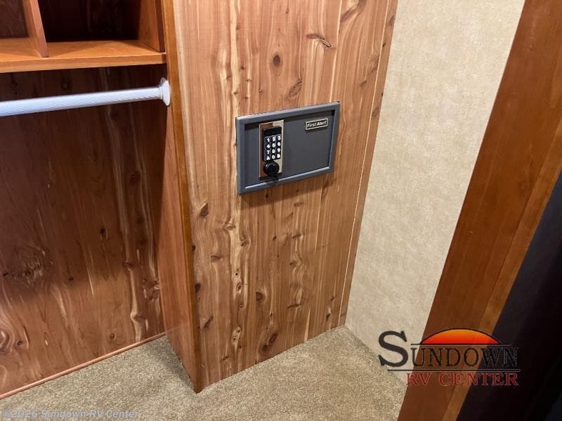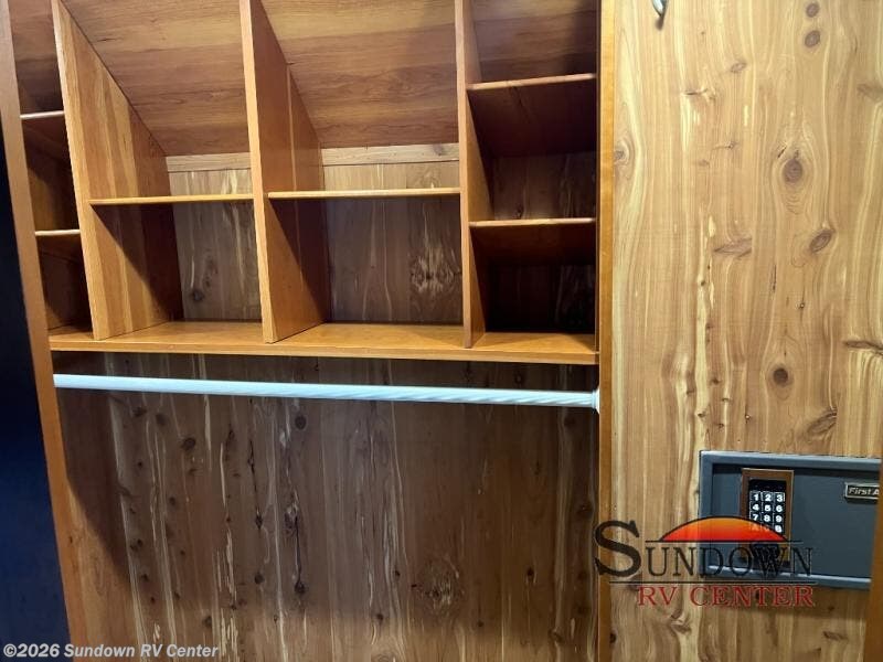 Along the rear wall find a sofa with two end tables. The sofa provides ample seating and perfect viewing of the power lift TV in the slide out opposite the door side. You can choose to add an optional fireplace if you like and there is also overhead storage too. Within that same slide out find a storage cabinet for your things, plus a range with convection oven, counter space, and a refrigerator. More storage is located just inside the main entry door where you will find a coat closet and pantry.