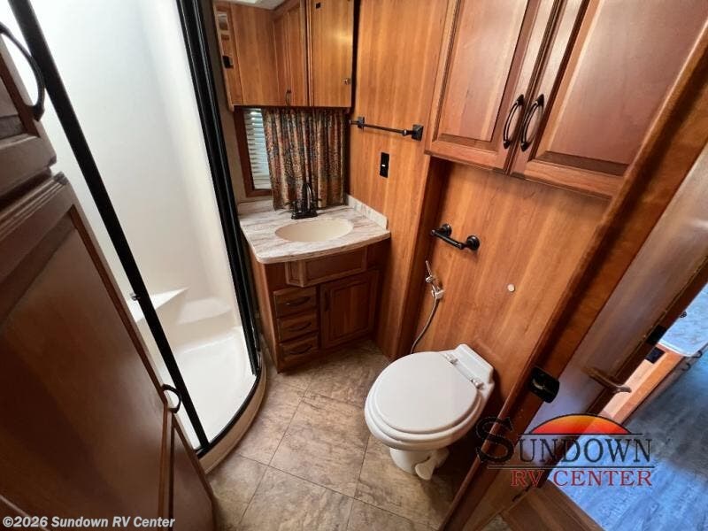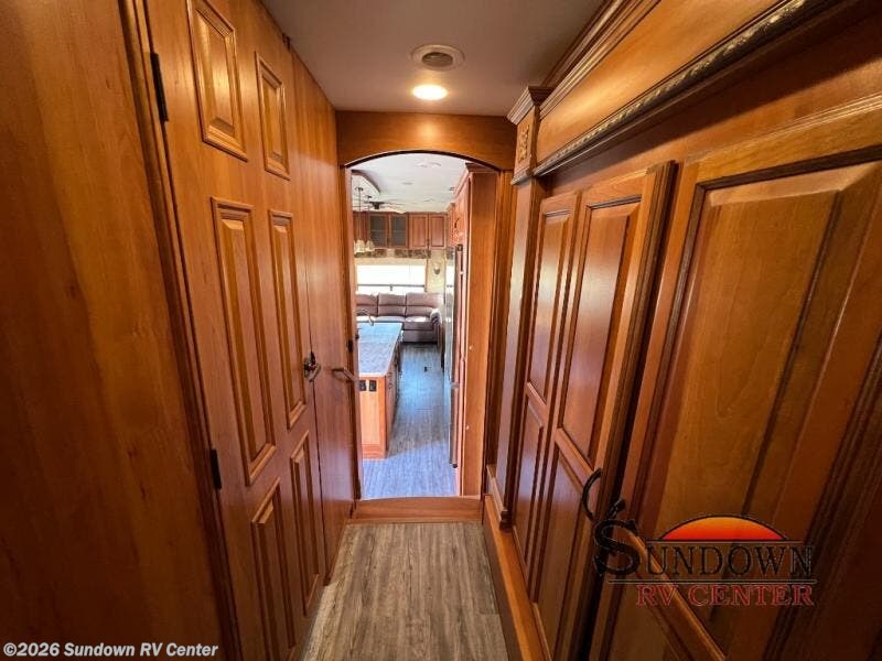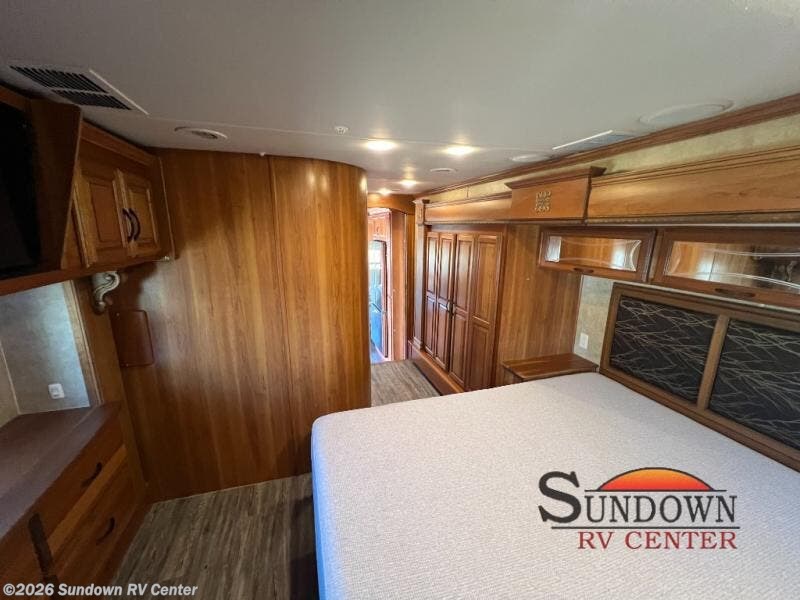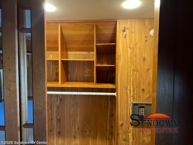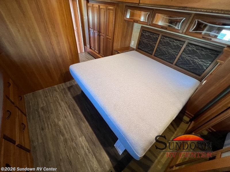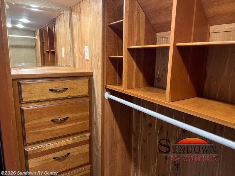 Head up the steps to a side aisle bath featuring a corner tub/shower, linen cabinet, sink with medicine cabinet overhead, and toilet. Out in the hall across from the bedroom find a slide out wardrobe prepped for a washer dryer that also includes a front king bed and nightstand. The wall opposite the bed is where you will find a vanity with drawers including overhead cabinets and a space for a TV overhead in the center. The front wall features a walk-in closet with organizer, dresser, and shelves, plus so much more!