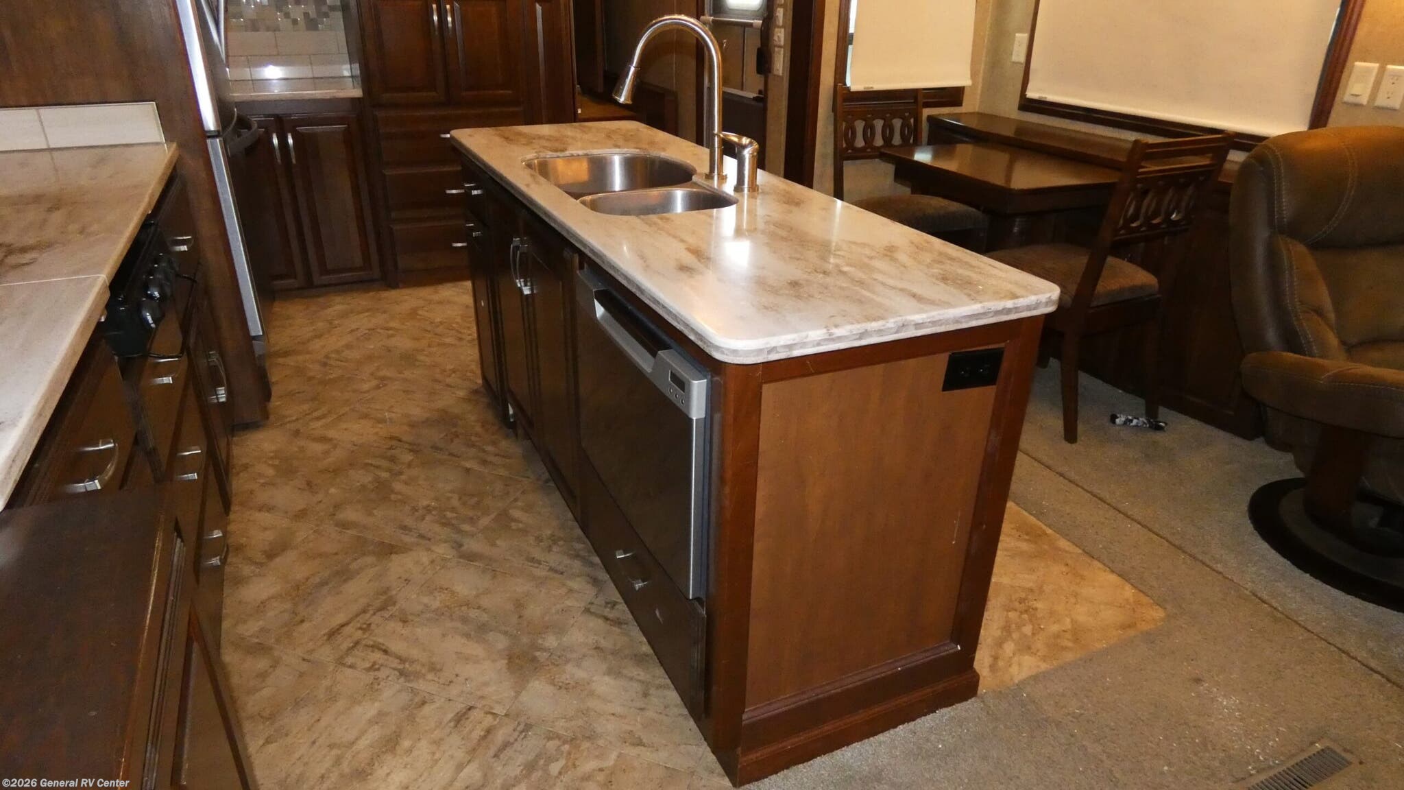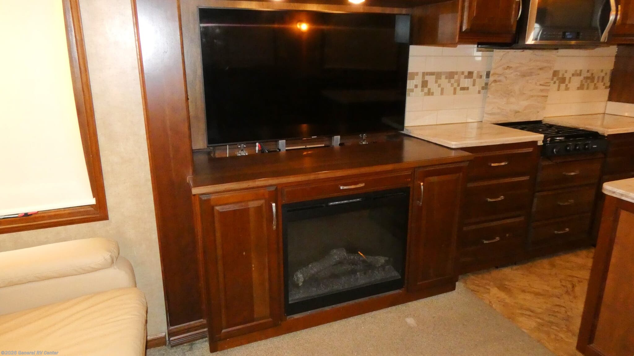 This Mobile Suites fifth wheel 38 RSSA by DRV Suites offers quadruple slide outs for added interior space, a rear living layout, king bed, kitchen island, and so much more! Step inside and be greeted by a wide open concept kitchen and living space with dual opposing slides. To the left of the entry door there is a dinette and two Lane recliners with overhead storage above both. The rear wall features a sofa with end tables and additional storage above. The opposite slide features the kitchen appliances and the living room entertainment center with power lift TV including a fireplace below. In the kitchen area you will find a refrigerator, a three burner range, counter space, and overhead storage in the slide. The convenient island provides more counter space, plus a dishwasher, double sinks, and trash container. Off to the side of the island there is a hutch with upper and lower storage, plus a pantry and electrical closet. To the right of the entry door there are steps that take you to a side aisle bath and front master suite. The bath features a toilet, closet washer/dryer, 32" x 48" tub/shower, and vanity with sink including medicine cabinet. Beyond the bath is a front master bedroom with slide out king size bed. There is a full front wall wardrobe with sliding doors. Inside find a chest and dresser storage. A vanity slide out opposite the bed features drawers and a 26" TV, and so much more!