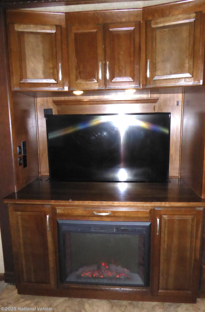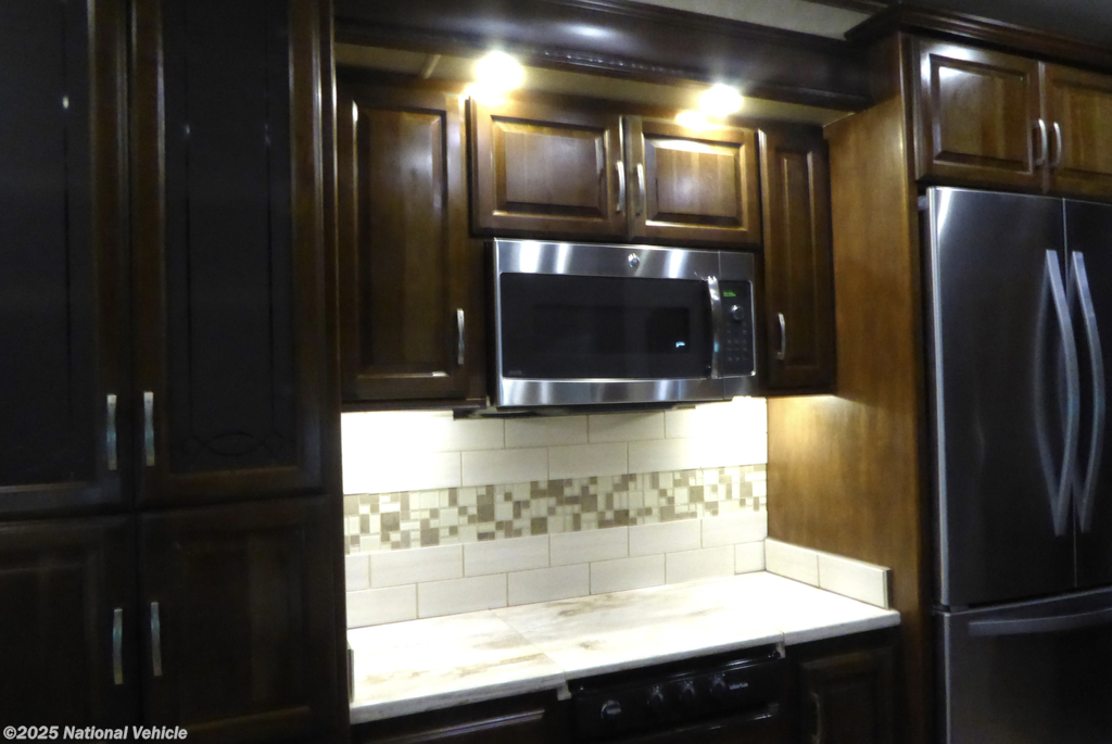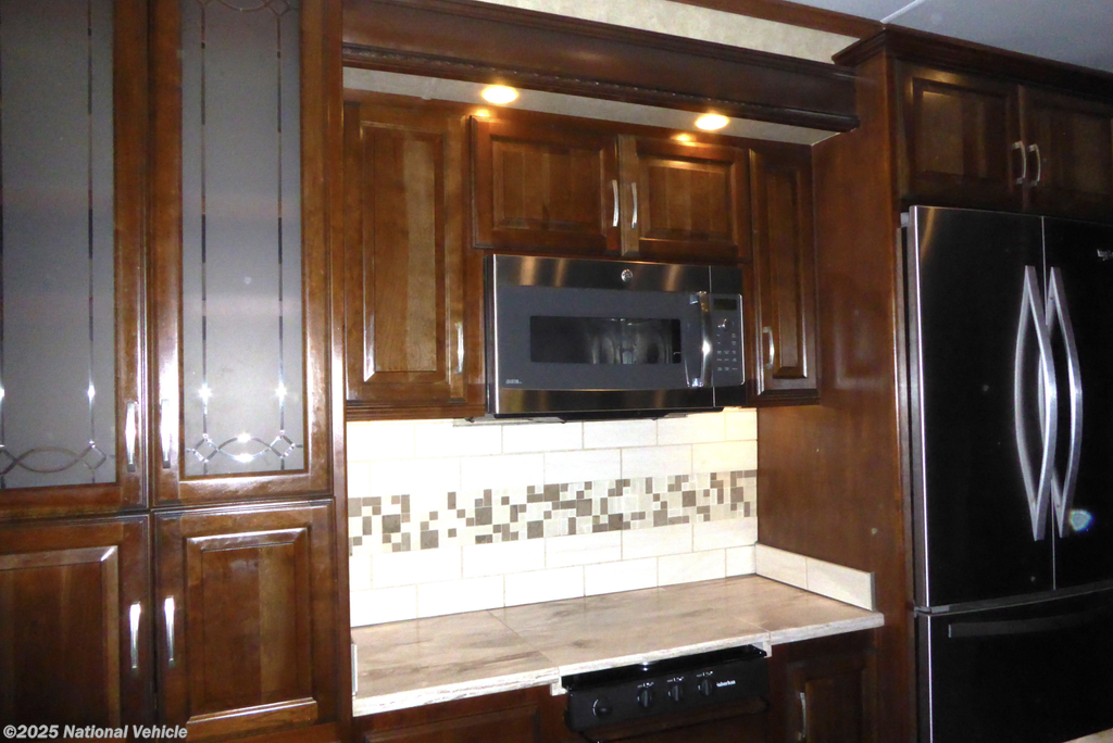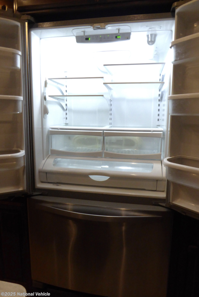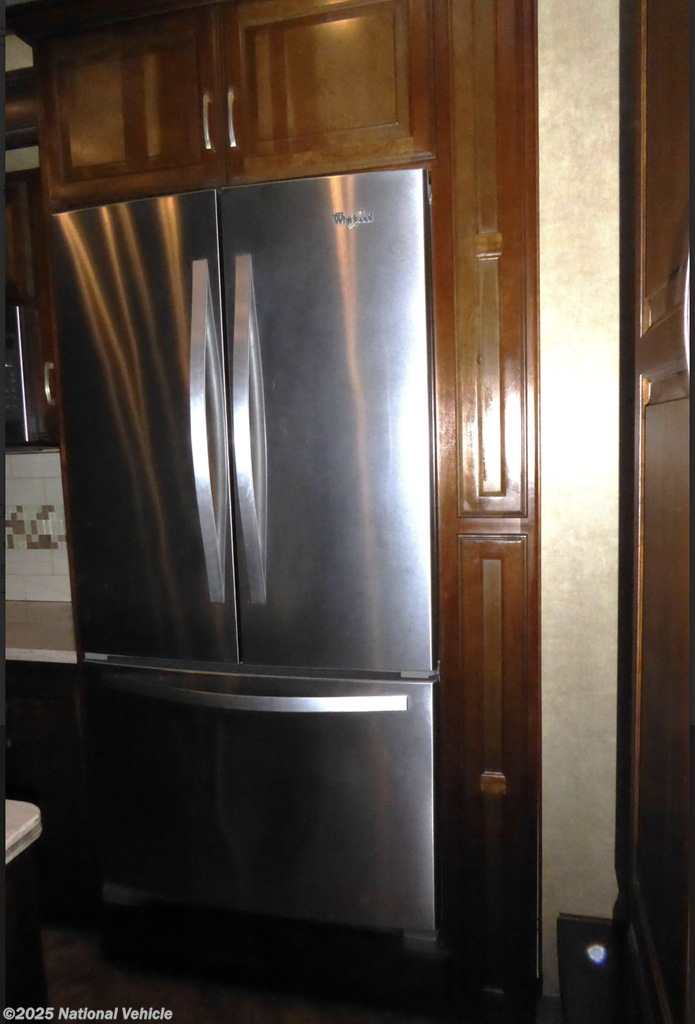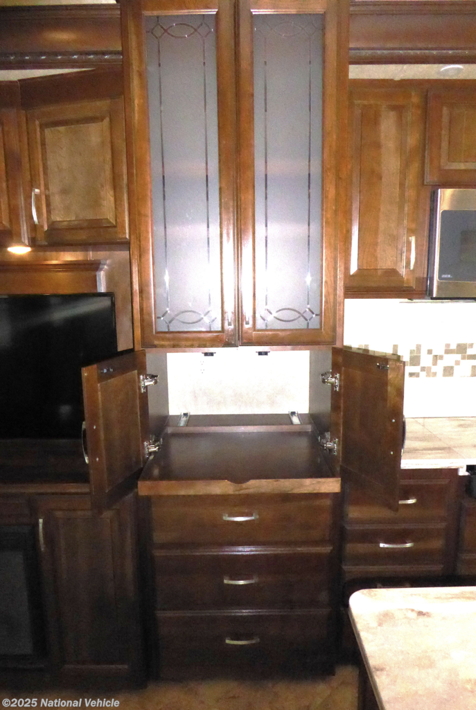 Step inside to a warm and inviting interior featuring quadruple slide-outs that create an expansive living space. The gourmet kitchen is a chef?s delight with solid-surface countertops, a residential refrigerator, convection microwave, three-burner cooktop, oven, and ample cabinetry, making meal preparation easy and enjoyable.