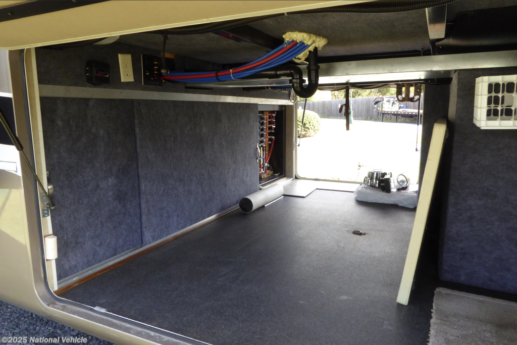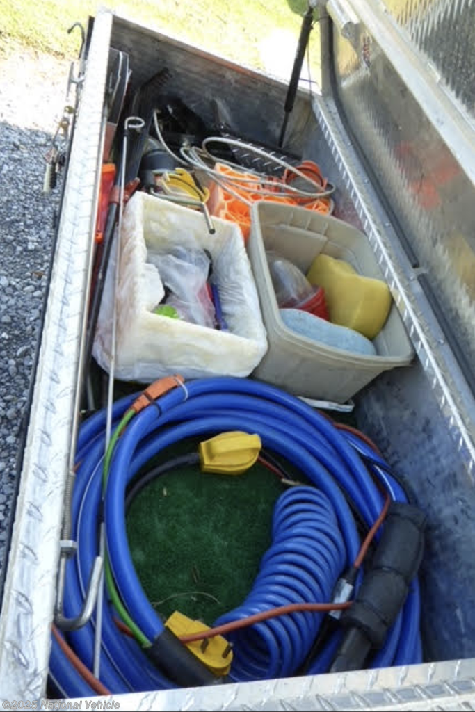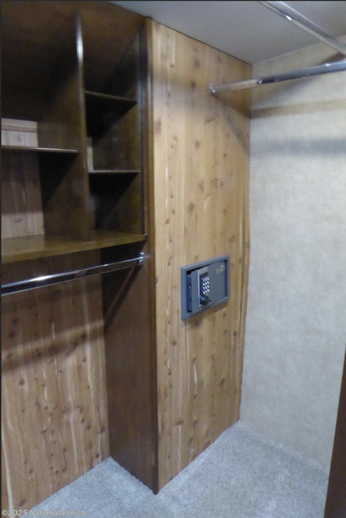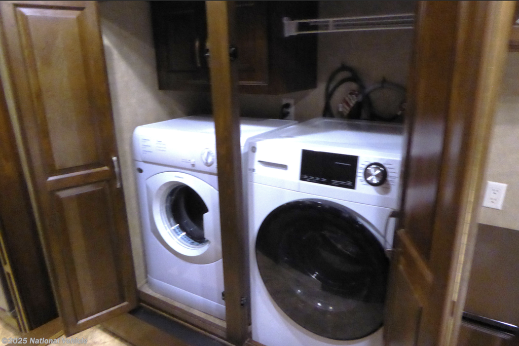 The spacious front master suite includes a queen-size bed, a large wardrobe with mirrored doors, dresser, and a washer/dryer, while the full bathroom features a residential shower, solid-surface vanity, and quality fixtures. Outside, the Mobile Suites 38RSSB3 impresses with ample pass-through storage, power awnings, and DRV?s renowned high-end finishes and attention to detail.