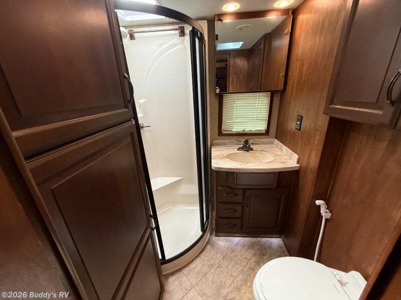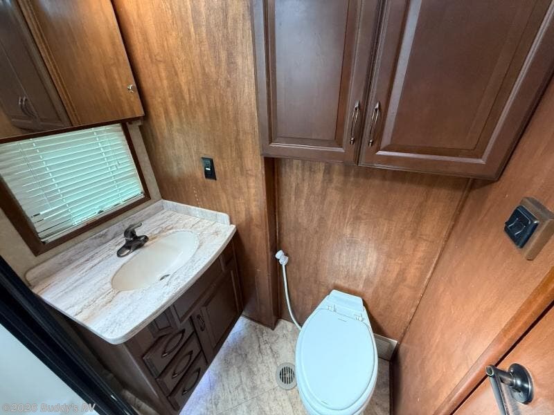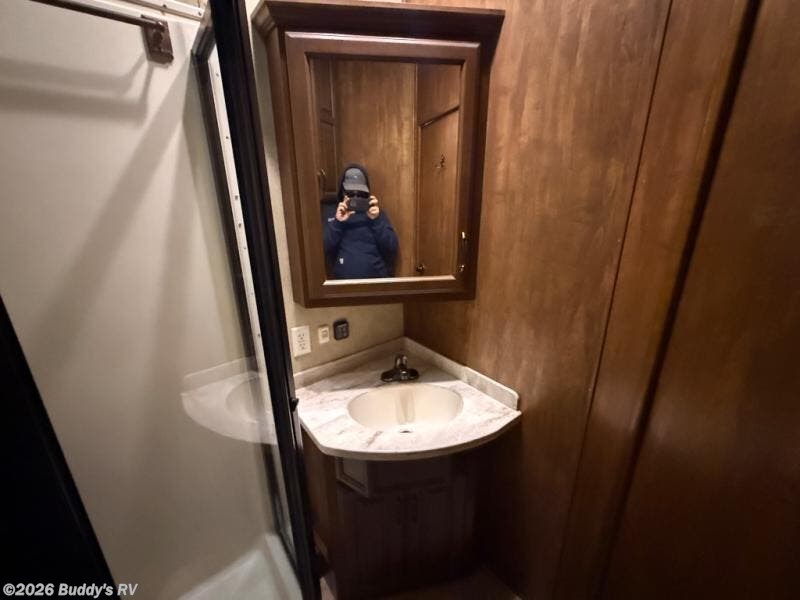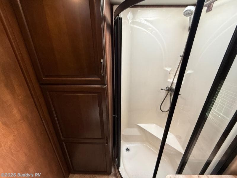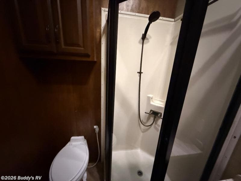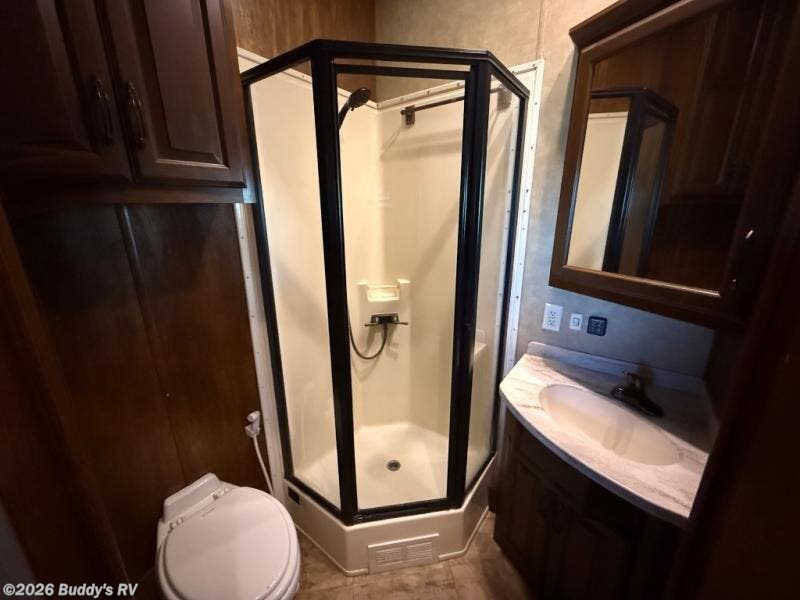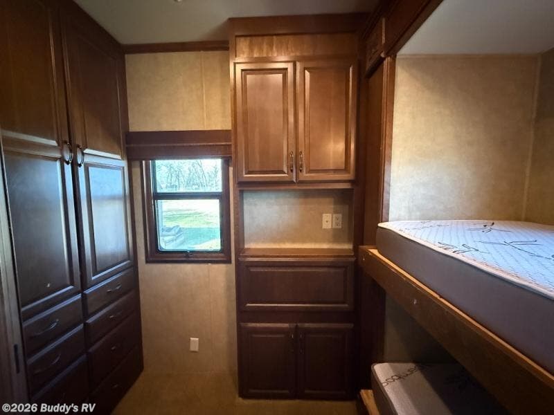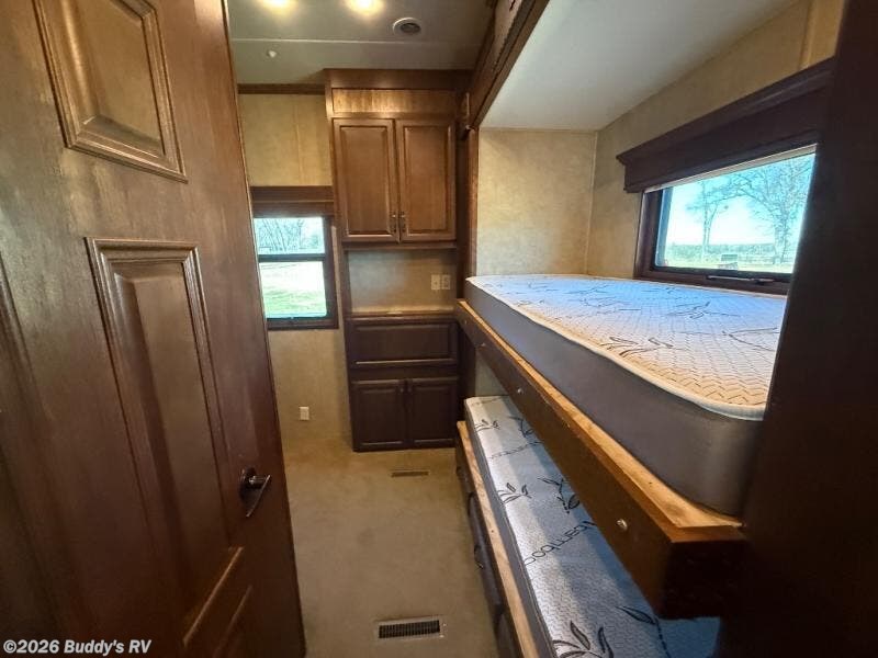 The very rear of this unit features a private bunkhouse where the kids will likely be. This can also be a perfect space for extra guest to have a little space to call their own. Inside find a set of 32" x 72" bunks that slide out. There is also a wardrobe opposite and a 26" TV including a desk along the rear wall. The full bath inside features a corner shower, toilet and sink, plus so much more!