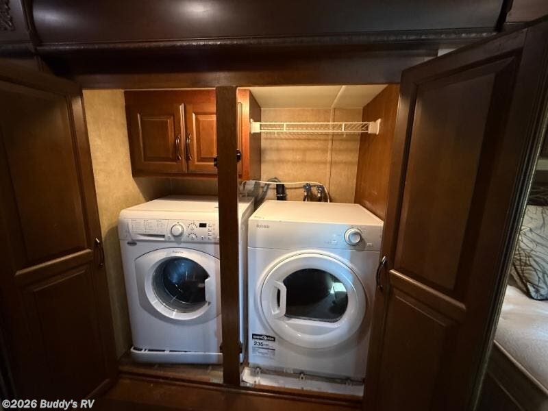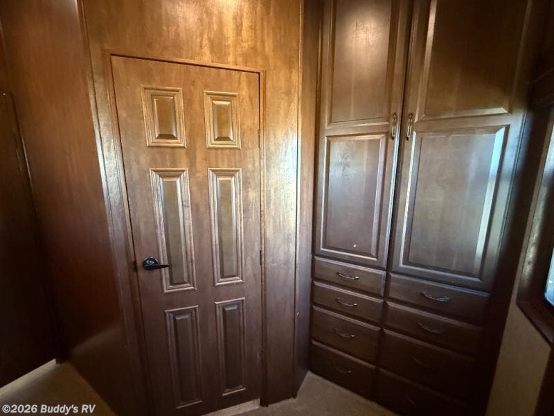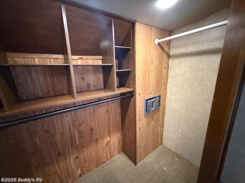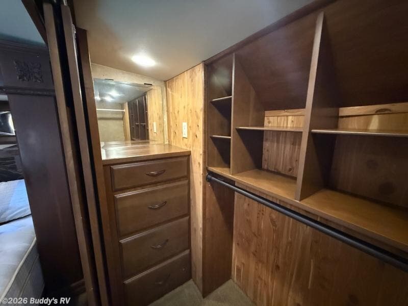 Just outside the bath door on the opposite side is a slide out wardrobe that has been prepped for a washer and dryer. This slide also contains a nightstand and king size bed with overhead space. Opposite the bed find a vanity with drawers, plus an overhead TV area and cabinets above. The walk-in cedar lined closet in front features plenty of storage with a dresser and shelving, plus closet organizer.