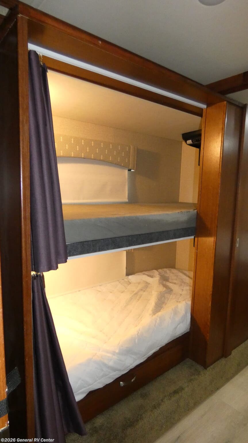 Stepping inside the FORCE 37FBH motor home by Dynamax, to the left there is a double kitchen sink, three burner range, microwave, refrigerator, and pantry. On the opposite side of the motor home you will notice the slide with a dinette and theater seats. Above the cab you will find a cab over bunk and 39" TV on an electric swivel bracket. The loveseat adds additional seating for you and your guests. Proceeding toward the rear of the motor home, the bathroom is on the right. Inside the bathroom there is a shower, sink, and toilet. In the bedroom you will find a king bed with a nightstand on one side of the bed and a closet with washer/dryer prep on the other side of the bed. Across from the bed there is a slide with a 32" TV cabinet, drawers, wardrobe, and a set of bunks.