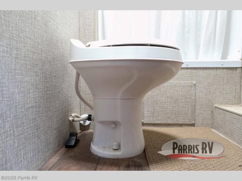 As you enter the trailer to the right there is a wardrobe. The bathroom is just past the front wardrobe. In the bathroom you will find a sink, toilet, and shower.