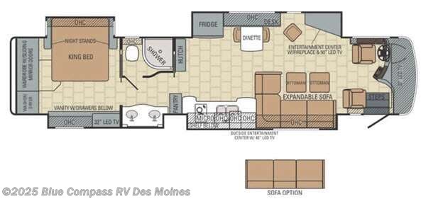 Along the passenger side of the motor home you will find a slide with an expandable sofa or an optional sofa, double kitchen sink, two burner range, and microwave. Next to the slide you will find a pantry. On the opposite side of the motor home there is a slide with an entertainment center, fireplace and 50" LED TV, dinette, and refrigerator. Next to the slide you will find a nice size hutch.