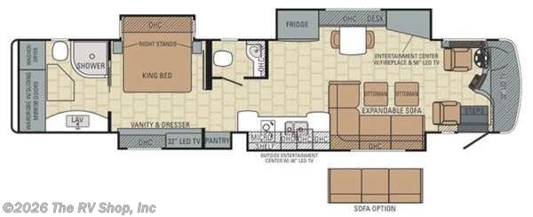 As you enter the motor home, on the passenger side there is a slide with an expandable sofa, or you can choose an optional sofa, double kitchen sink, two burner range, and a microwave. On the opposite side of the motor home you will find a slide with an entertainment center, fireplace and 50" LED TV, dinette, and refrigerator.