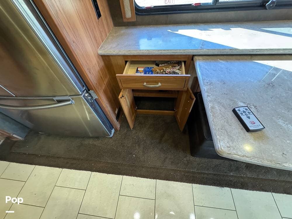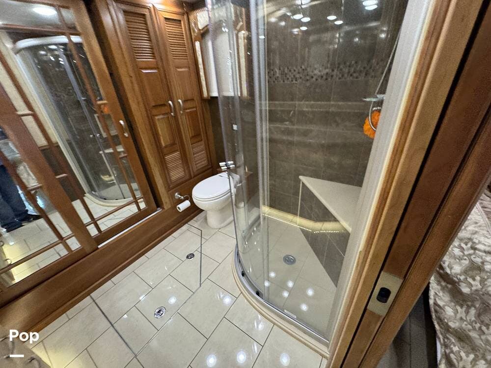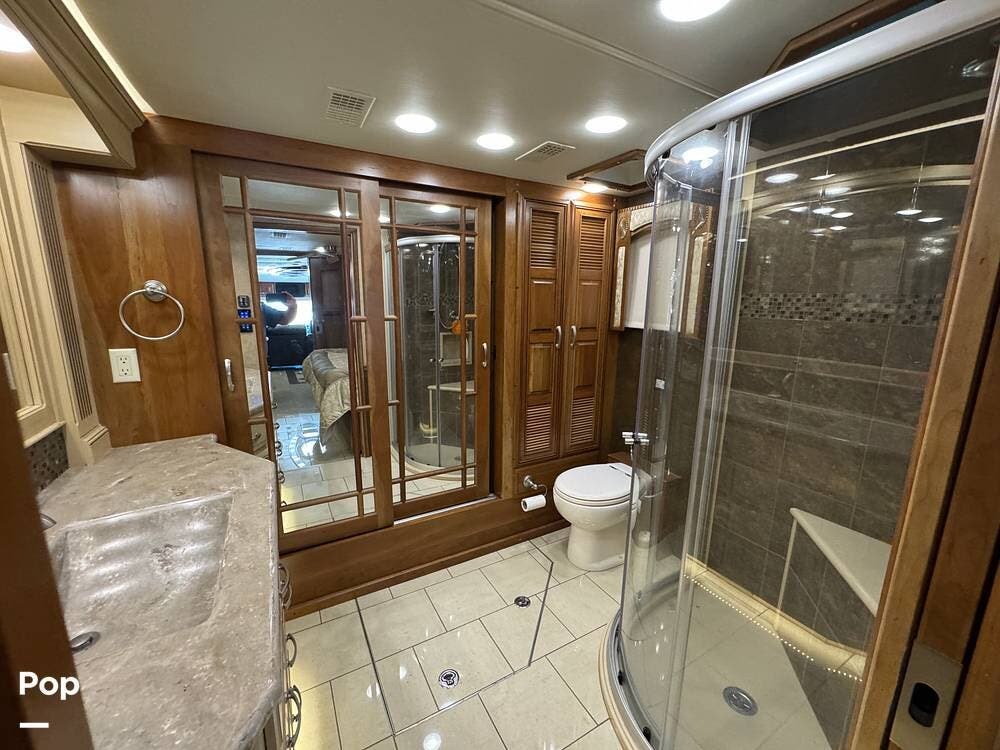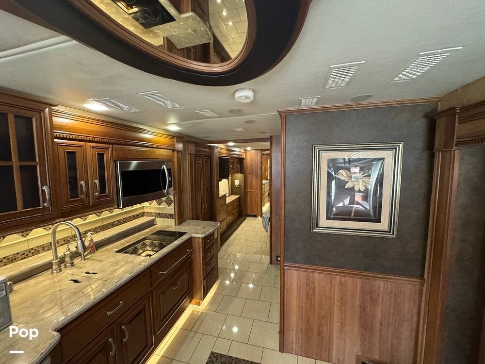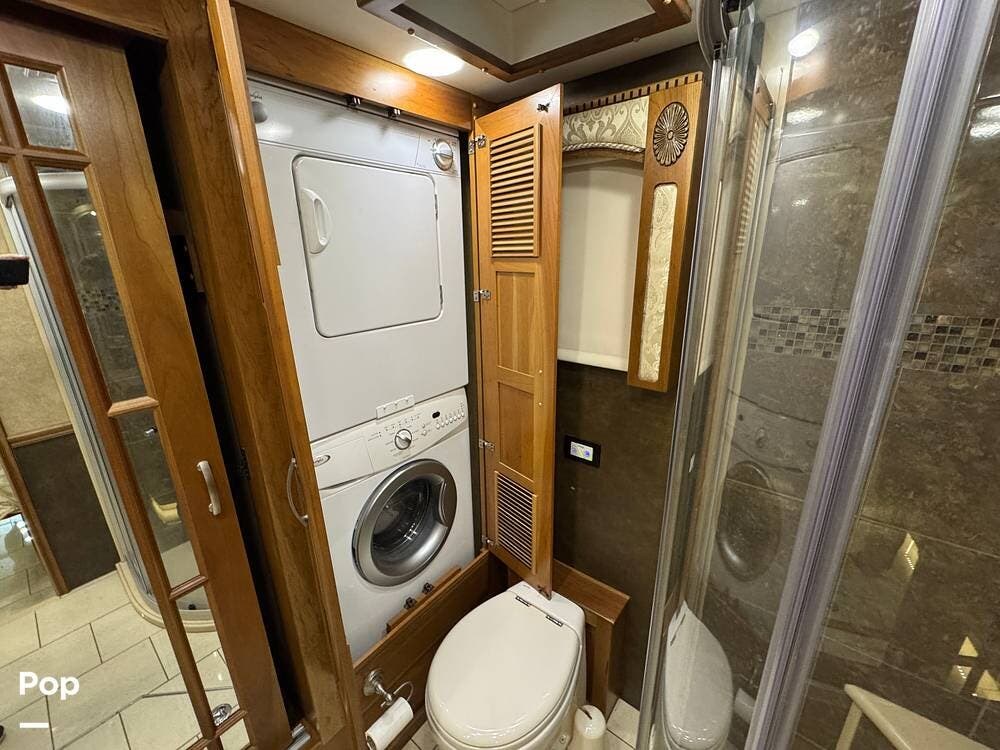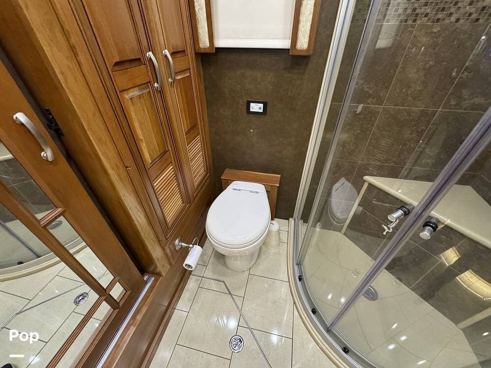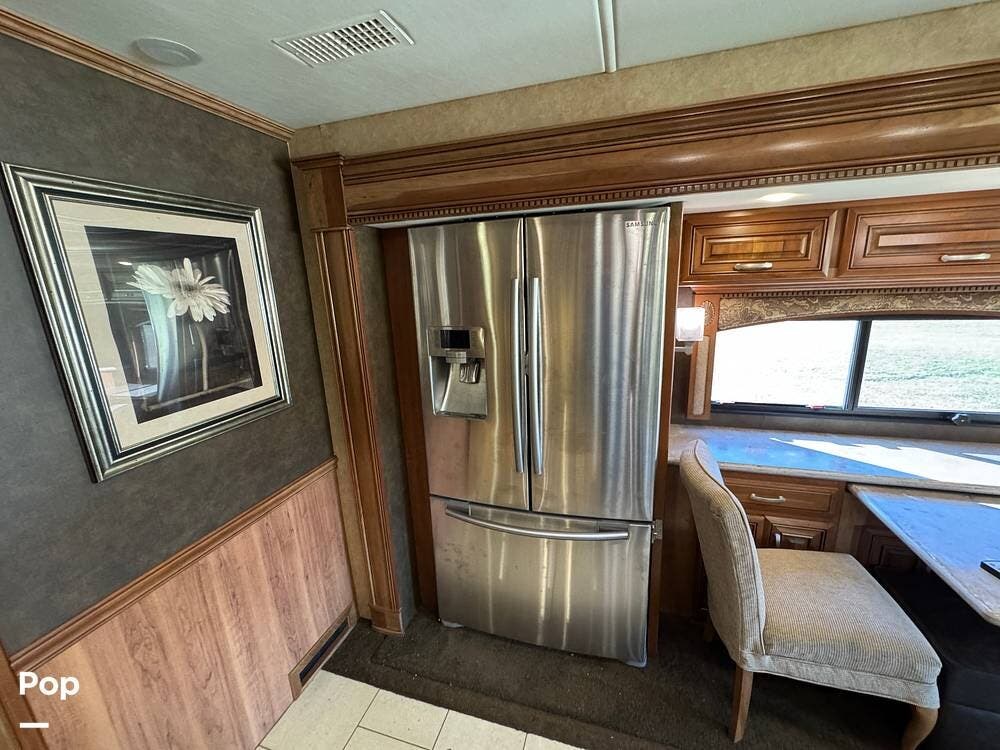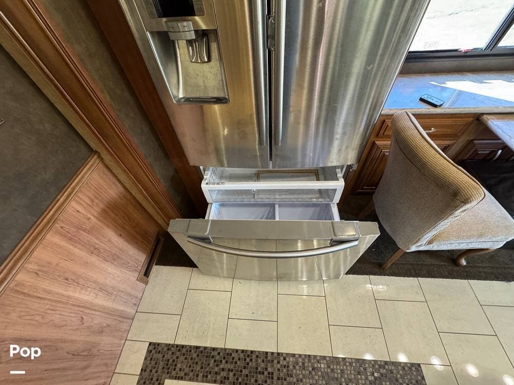 The kitchen continues the residential theme with high-quality appliances, excellent countertop space, and thoughtful storage throughout. It is well-arranged for preparing meals on the road, and the dining area is positioned for both convenience and comfort. A recently installed refrigerator adds value and peace of mind for the next owner.