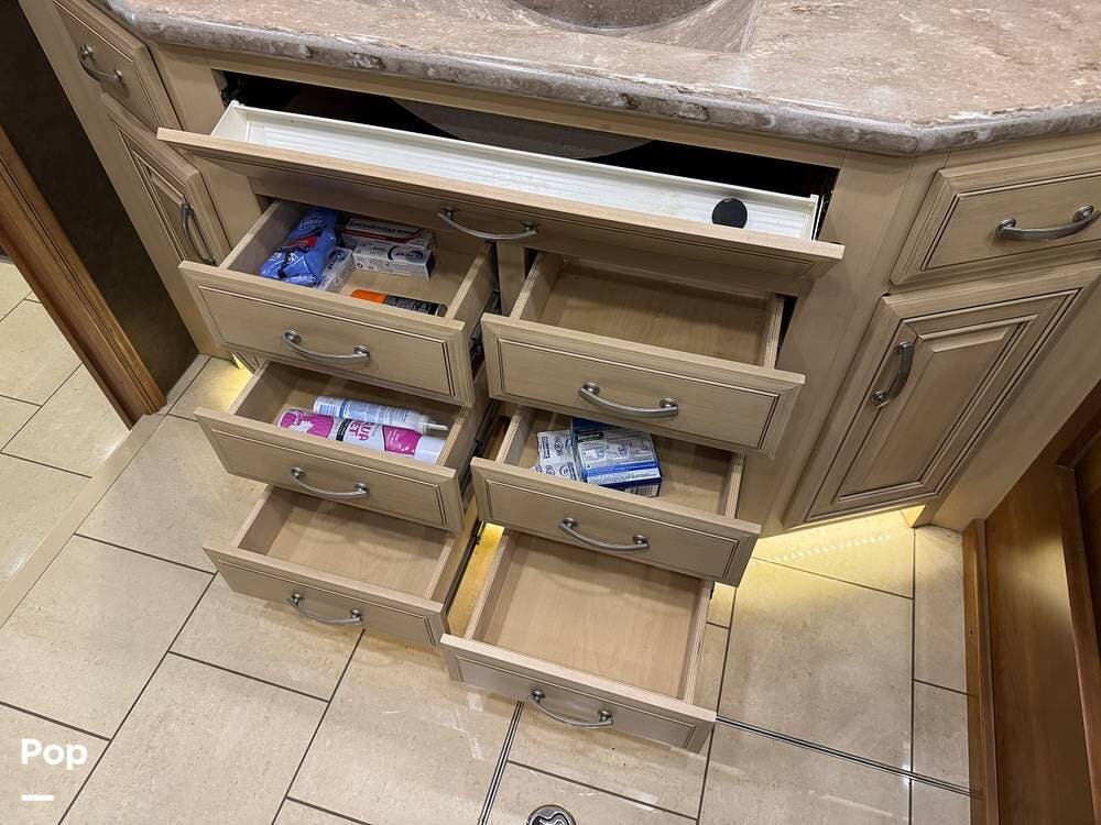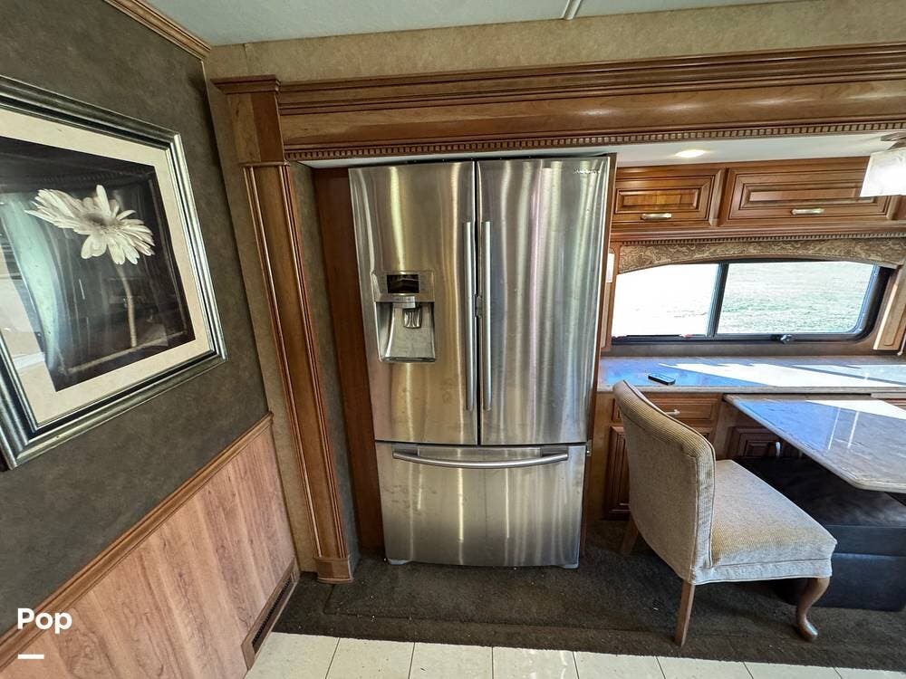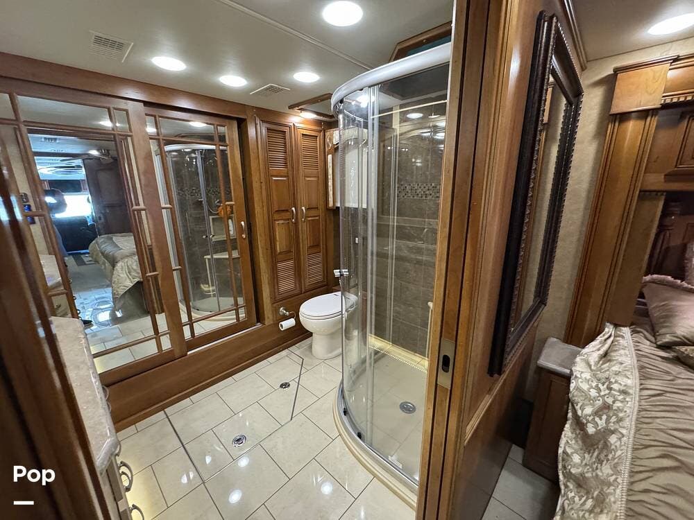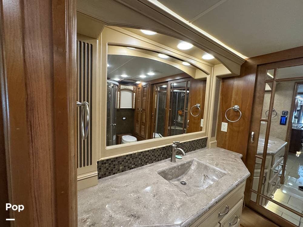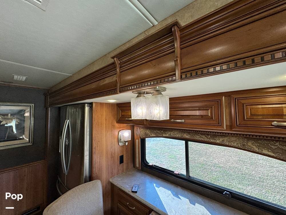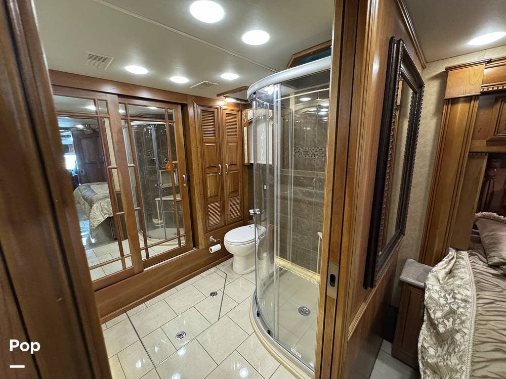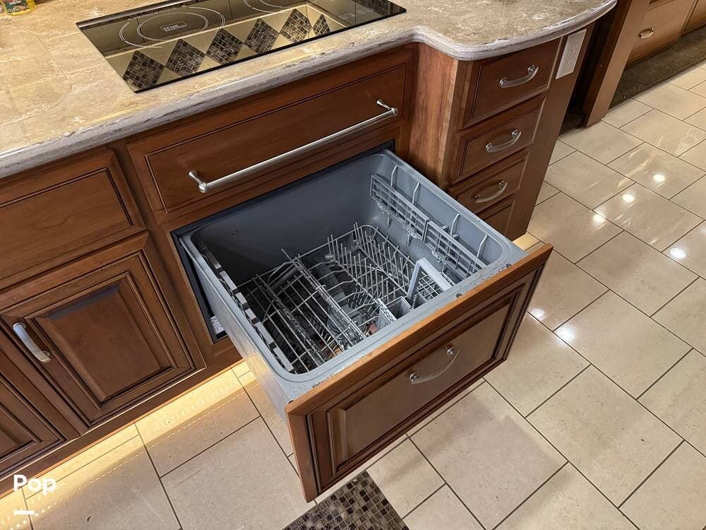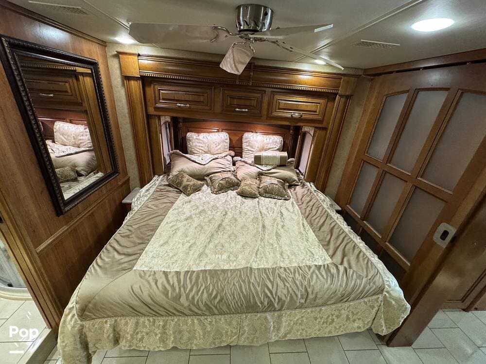 The kitchen continues the residential theme with high-quality appliances, excellent countertop space, and thoughtful storage throughout. It is well-arranged for preparing meals on the road, and the dining area is positioned for both convenience and comfort. A recently installed refrigerator adds value and peace of mind for the next owner.