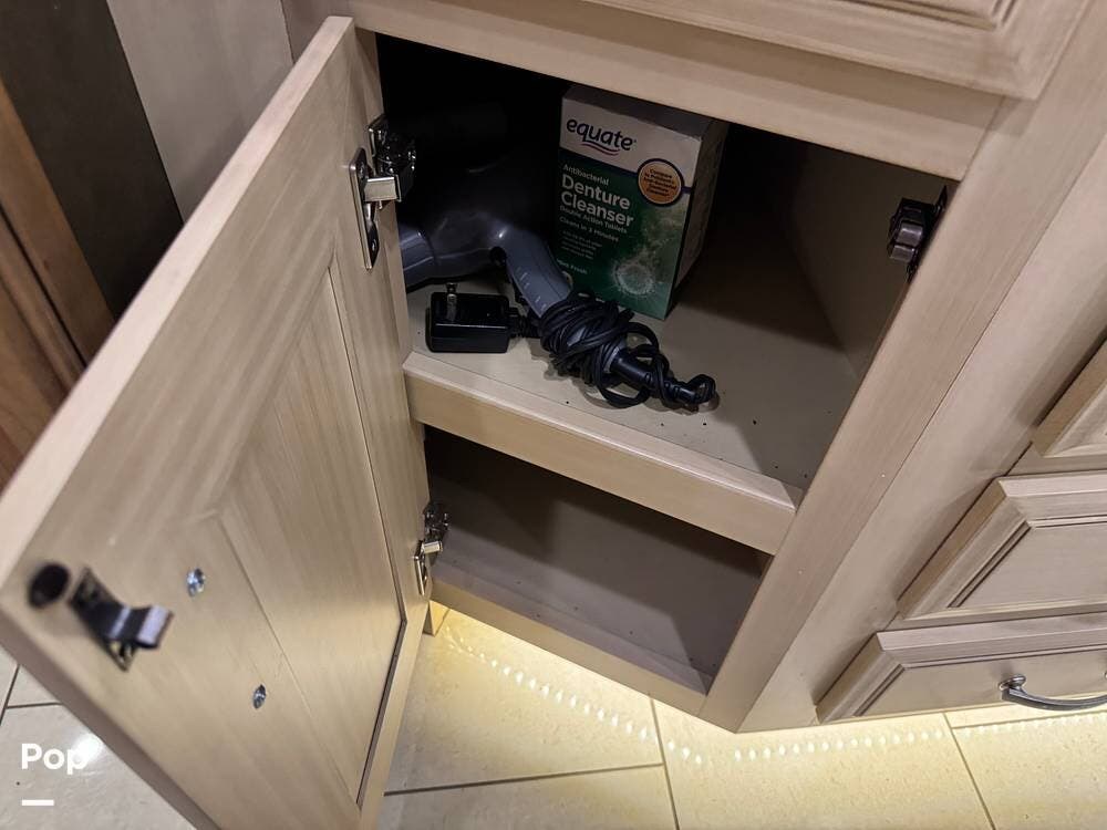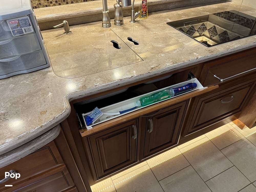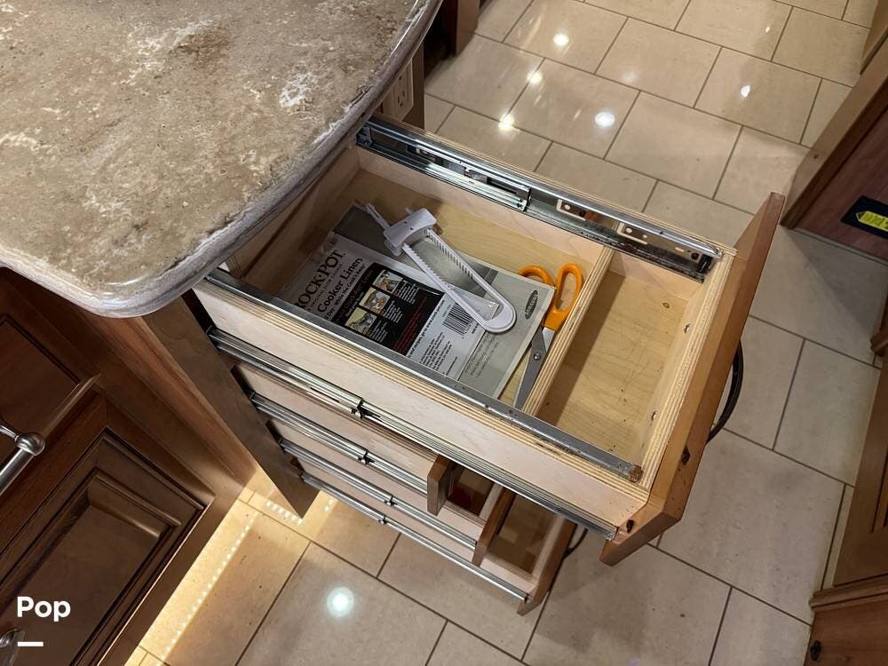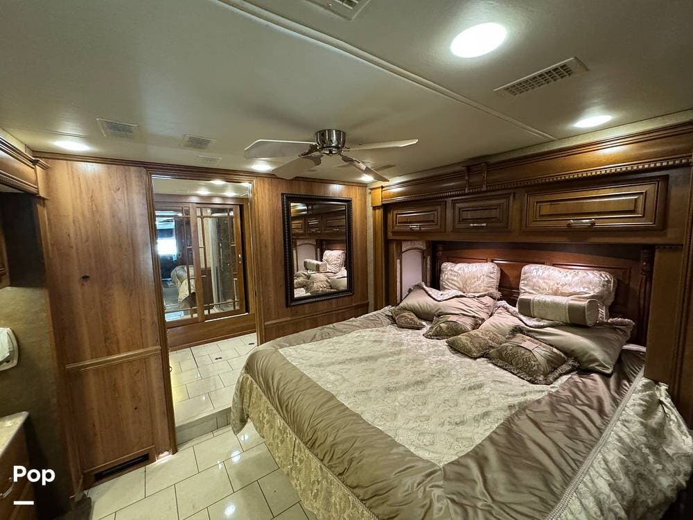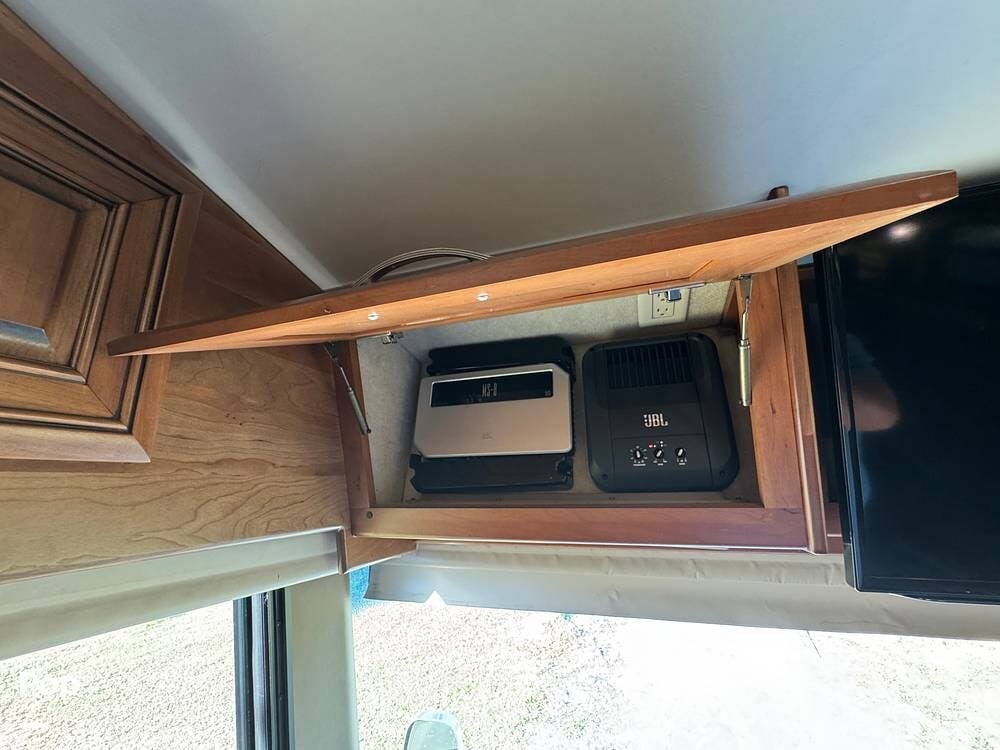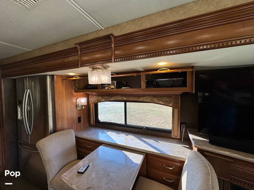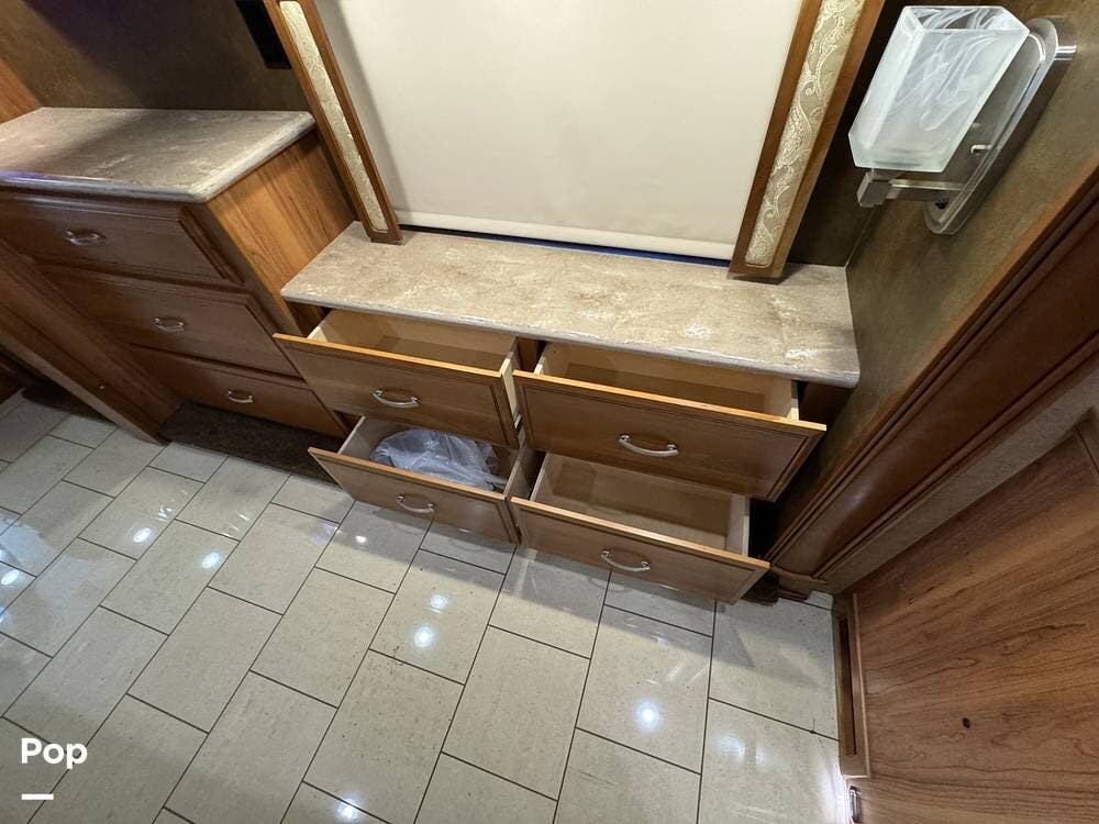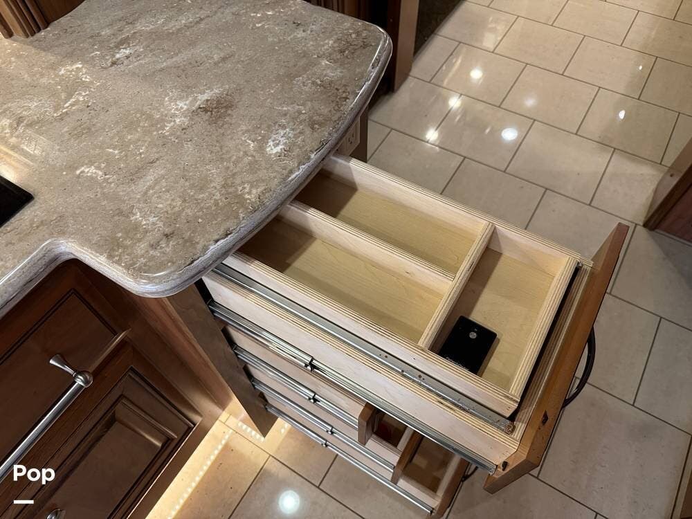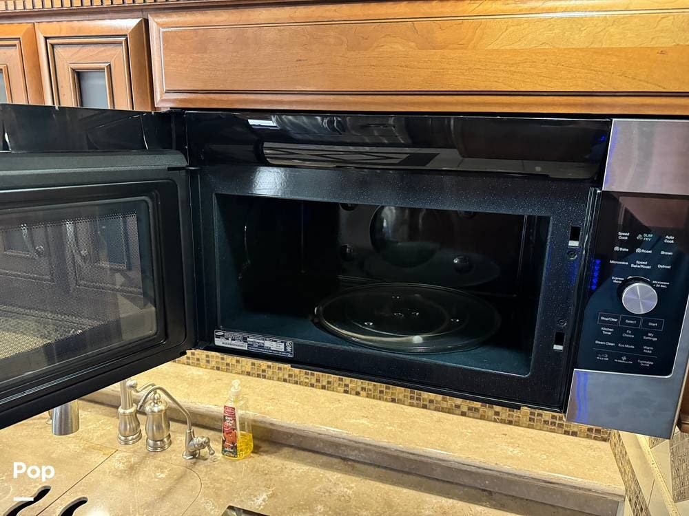 The kitchen continues the residential theme with high-quality appliances, excellent countertop space, and thoughtful storage throughout. It is well-arranged for preparing meals on the road, and the dining area is positioned for both convenience and comfort. A recently installed refrigerator adds value and peace of mind for the next owner.