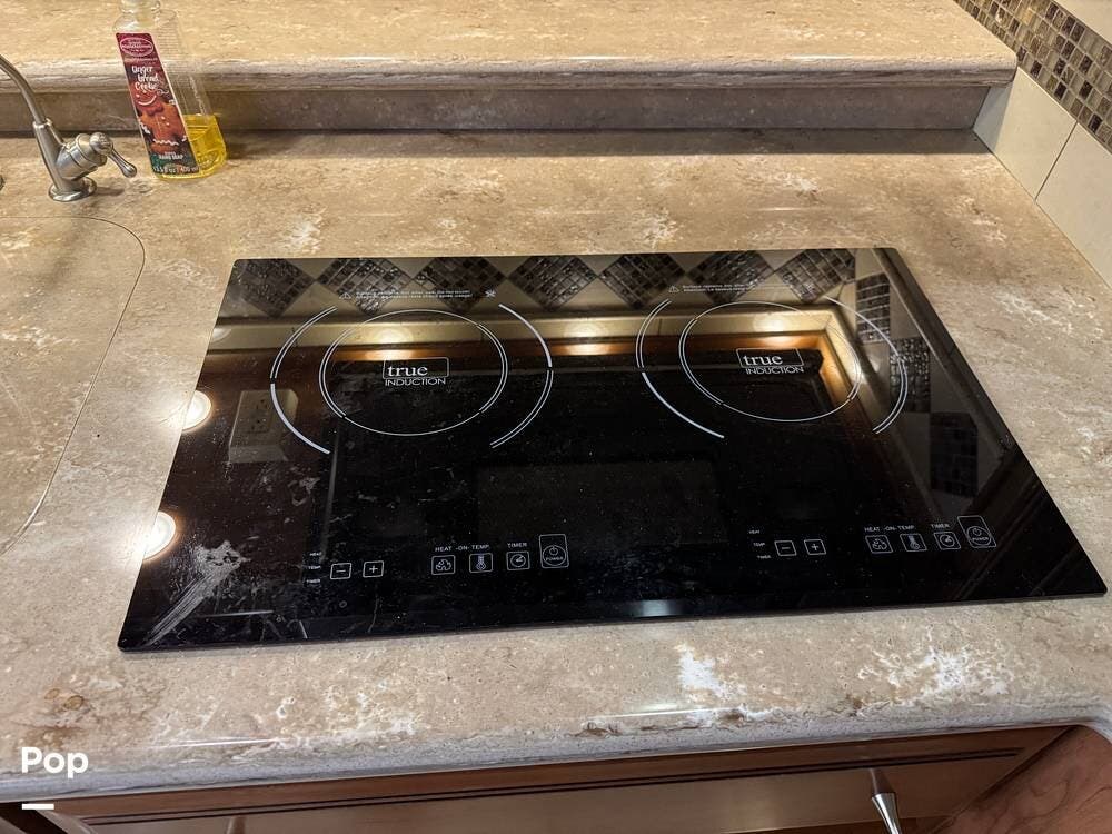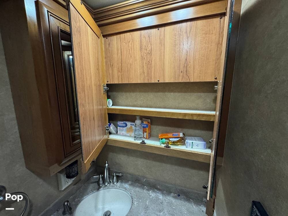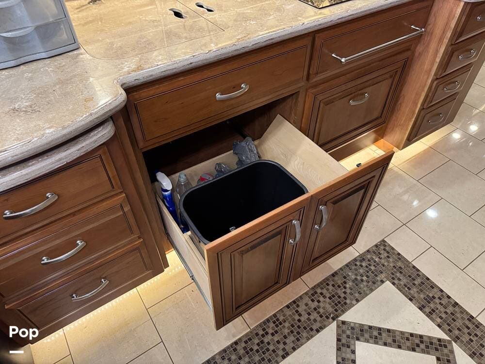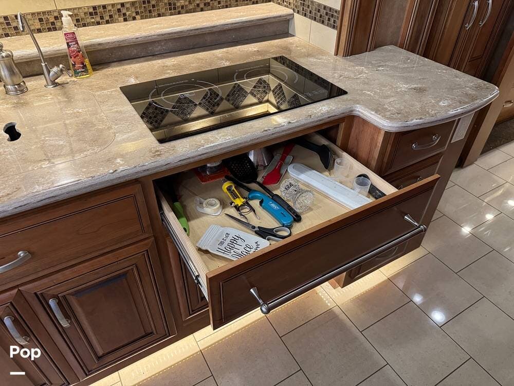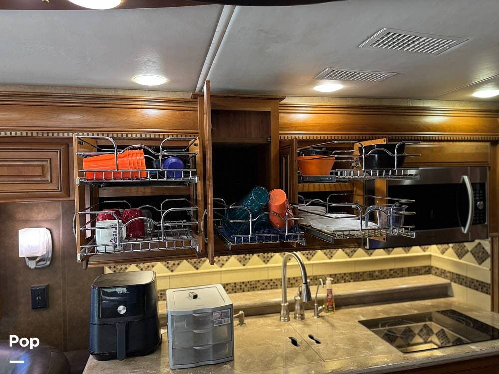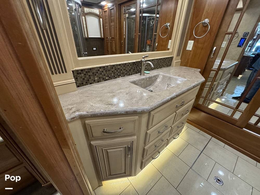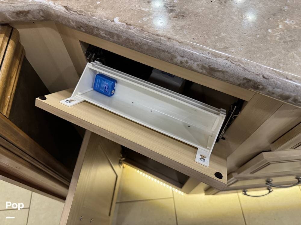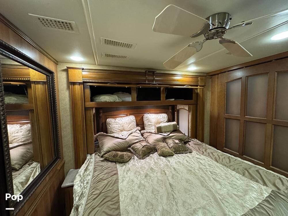 The kitchen continues the residential theme with high-quality appliances, excellent countertop space, and thoughtful storage throughout. It is well-arranged for preparing meals on the road, and the dining area is positioned for both convenience and comfort. A recently installed refrigerator adds value and peace of mind for the next owner.