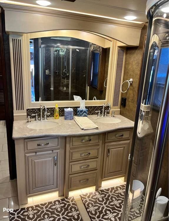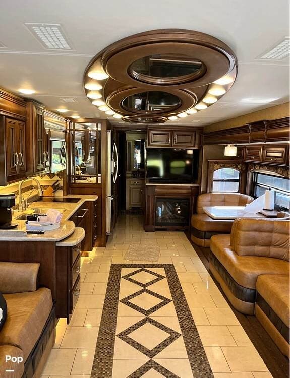 Polished porcelain flooring, hardwood cabinetry, and four slides create a refined, home-like atmosphere within this premium motor coach.