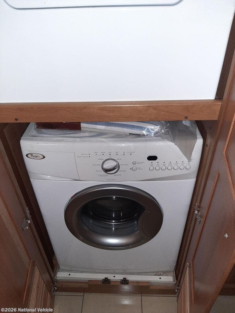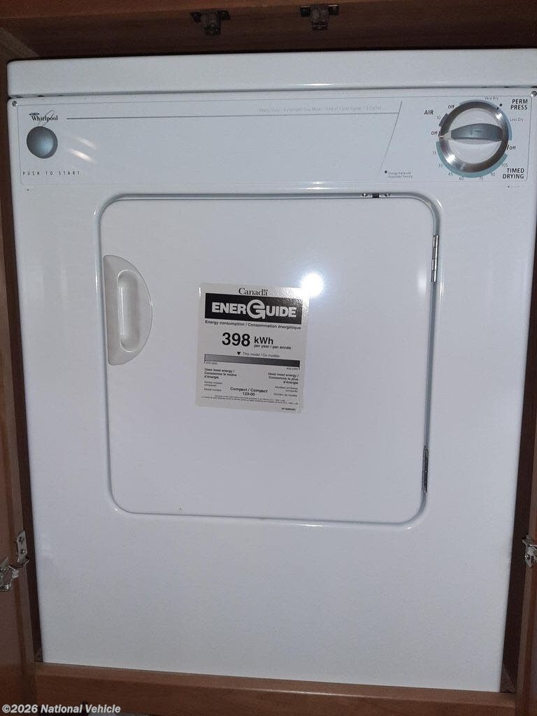 The bedroom offers a slide with a king size bed with nightstands and overhead storage. Across from the bed there is a slide out with a vanity with drawers below, a 32" LED TV, an overhead cabinet, and a washer/dryer.