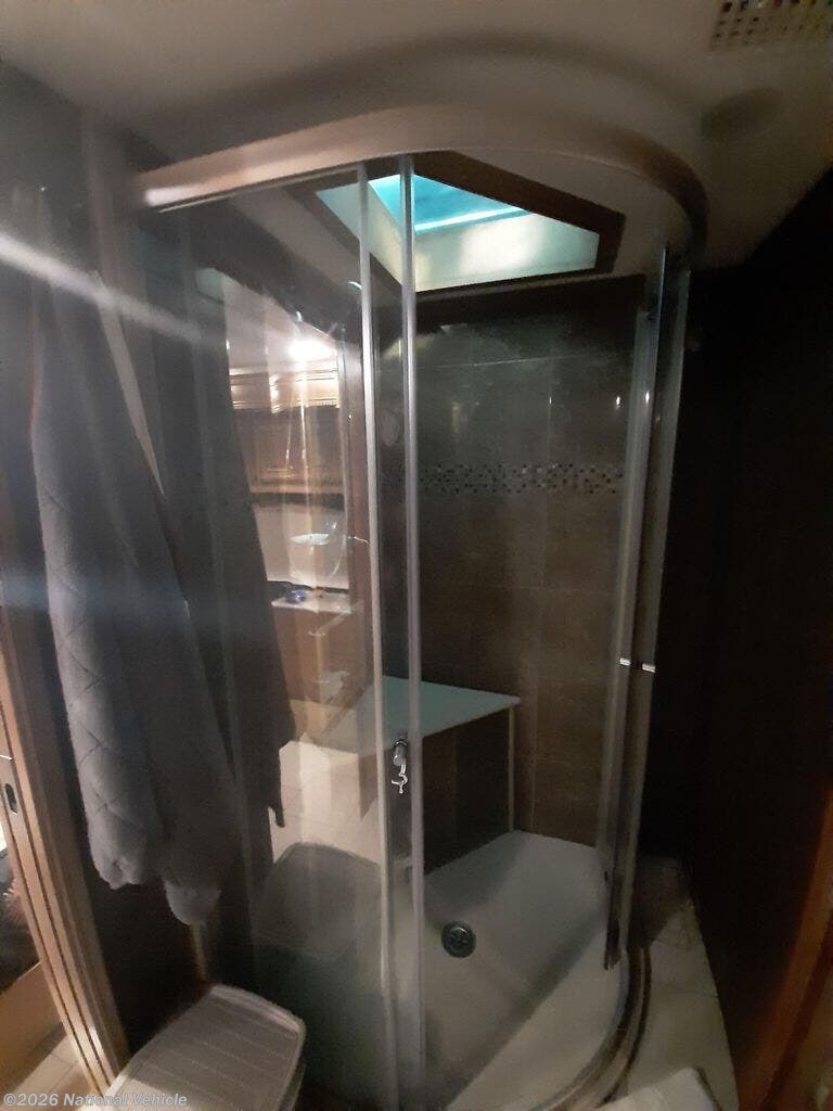 The rear bathroom includes a corner shower on one side and a toilet with a sink and medicine cabinet on the other side of the motor home. Along the full rear wall you will find a wardrobe with sliding mirror doors.
