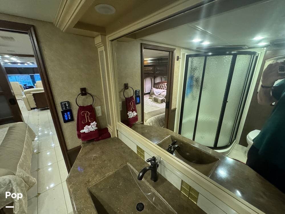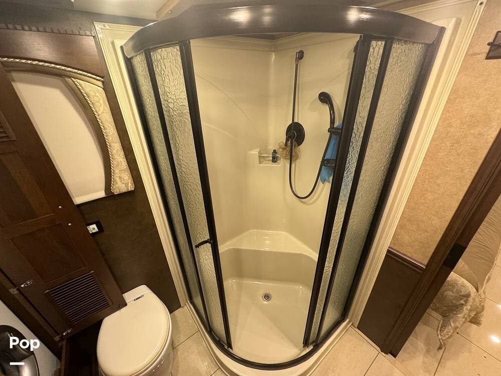 This bathroom features the same style of beautiful hardwood cabinetry found in the rest of the coach. The shower is fully enclosed.