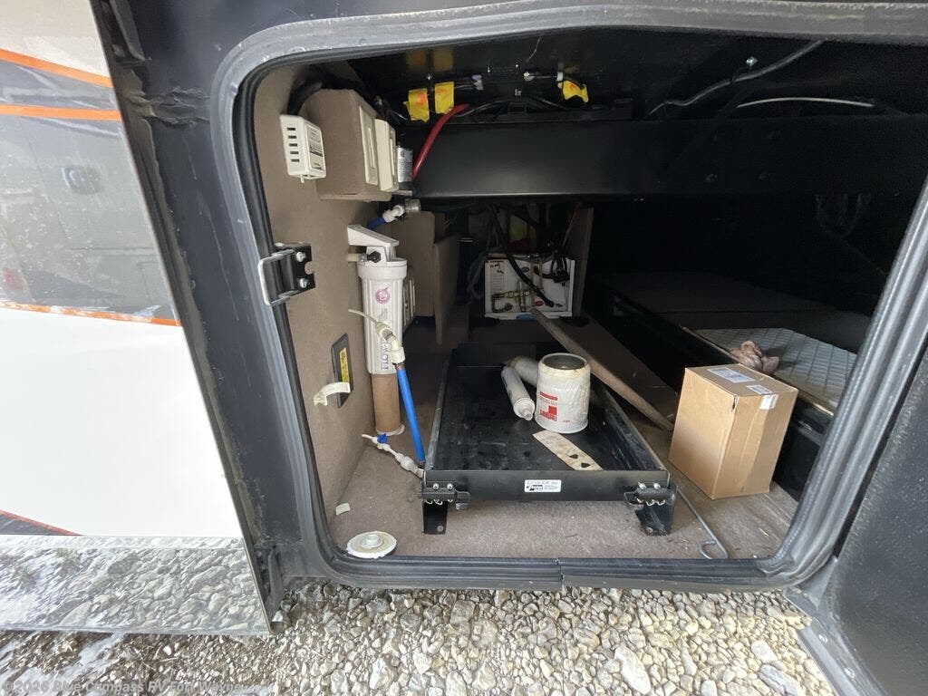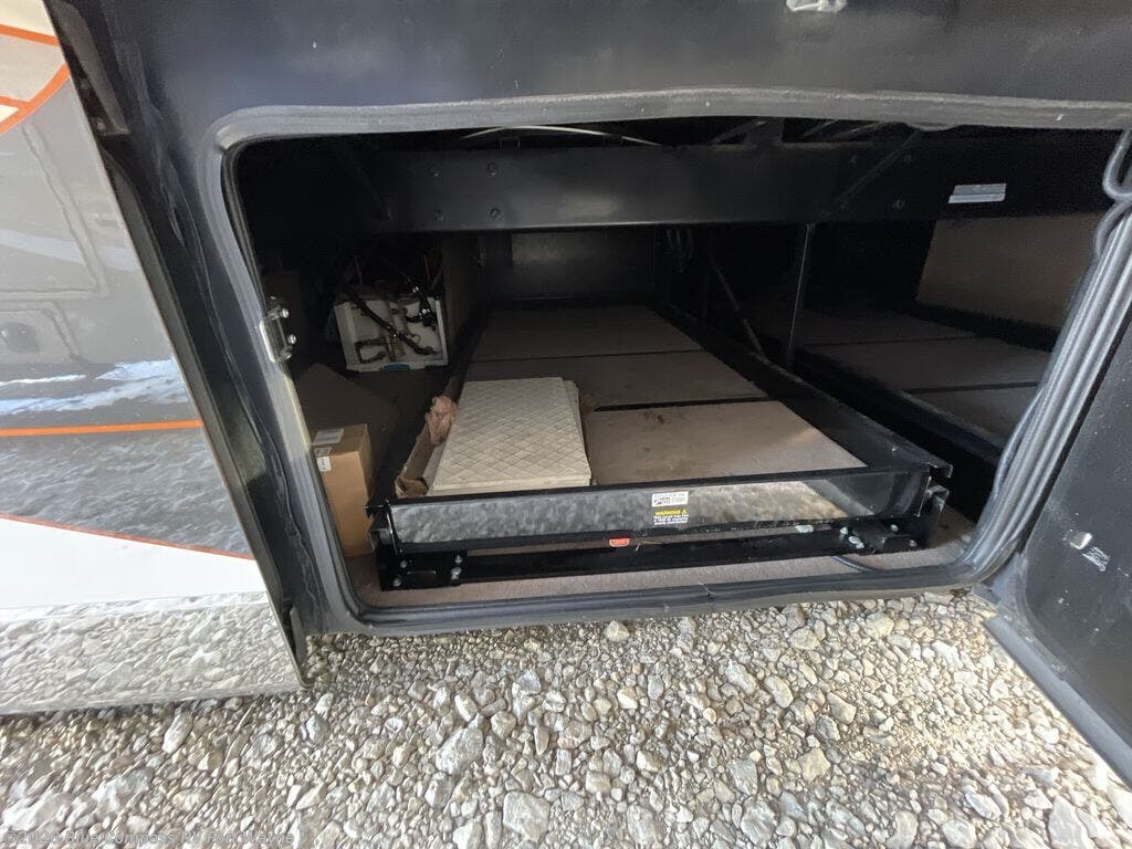 On the passenger side of the motor home you will find a slide with an expandable sofa or you can choose an optional hide-a-bed sofa, double kitchen sink, two burner range, and microwave. The opposite side of the motor home offers a slide with an entertainment center with fireplace and a 50" LED TV, dinette, and refrigerator.
