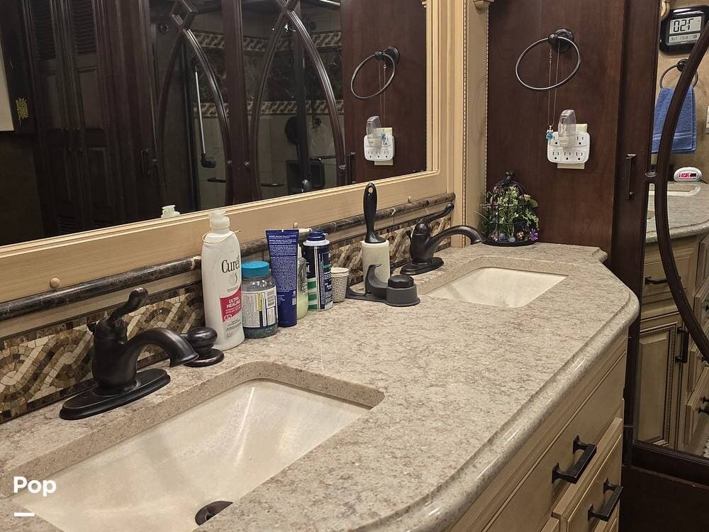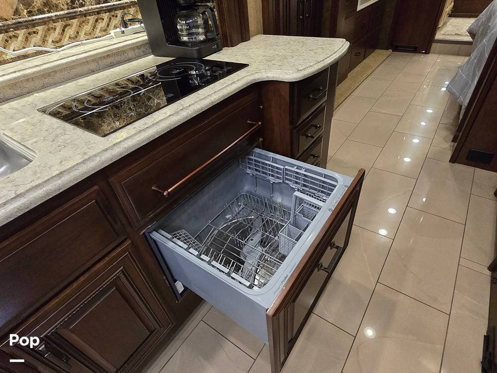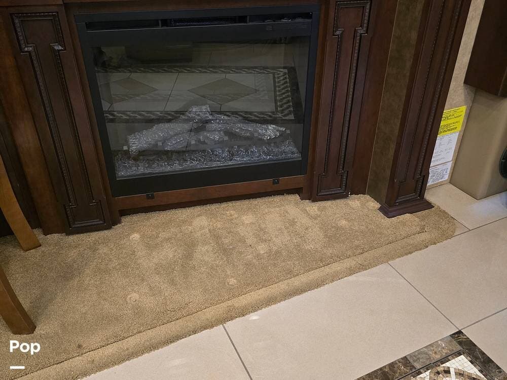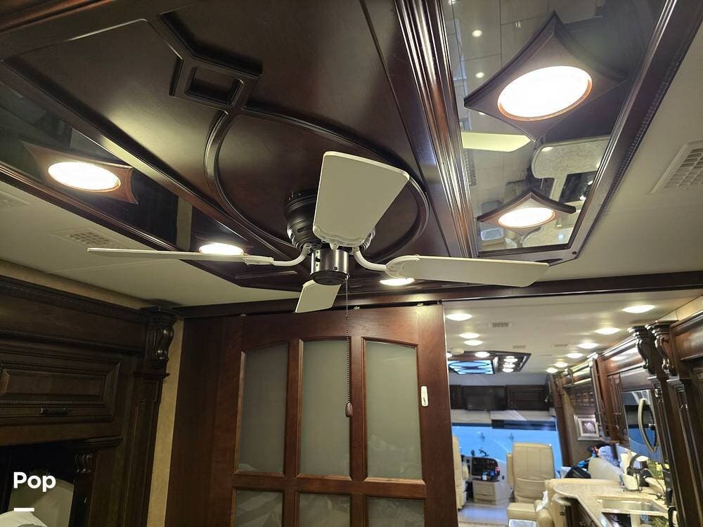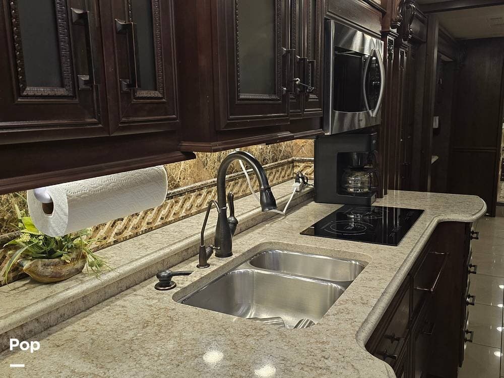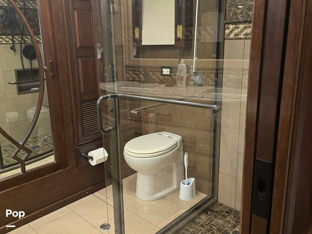 Inside, you'll be welcomed by high-gloss porcelain tile floors, handcrafted hardwood cabinetry, and Villa ultra-leather furniture. The 45B floorplan is thoughtfully designed with four slide-outs, a spacious living area with a fireplace and entertainment center, a fully equipped galley with residential appliances, and a half bath for guests. Retreat to the luxurious master suite featuring a king bed, ceiling fan, and massive wardrobe, followed by a spa-inspired rear bath complete with a dual-sink vanity, stacked washer/dryer, and a large tiled shower.