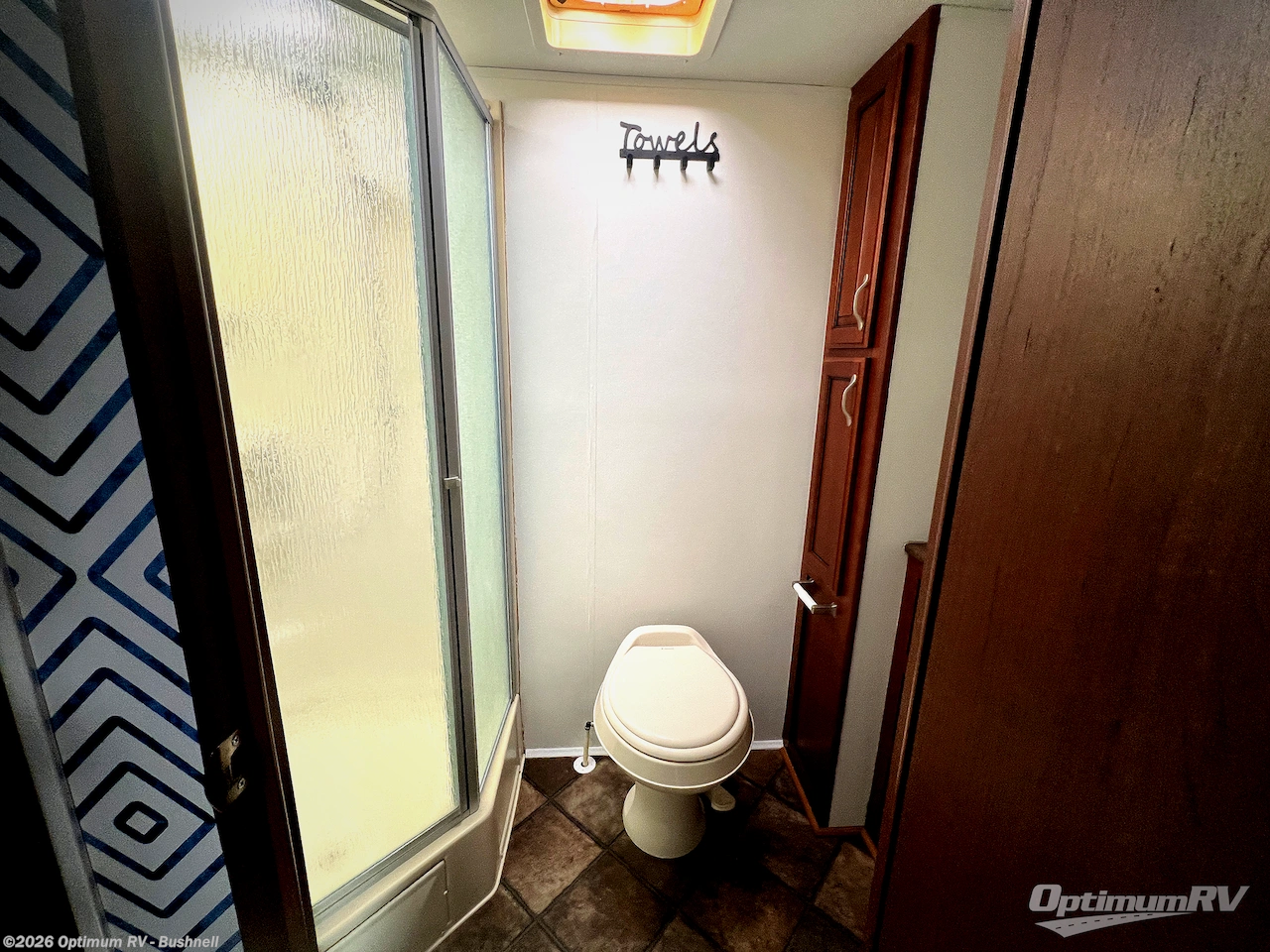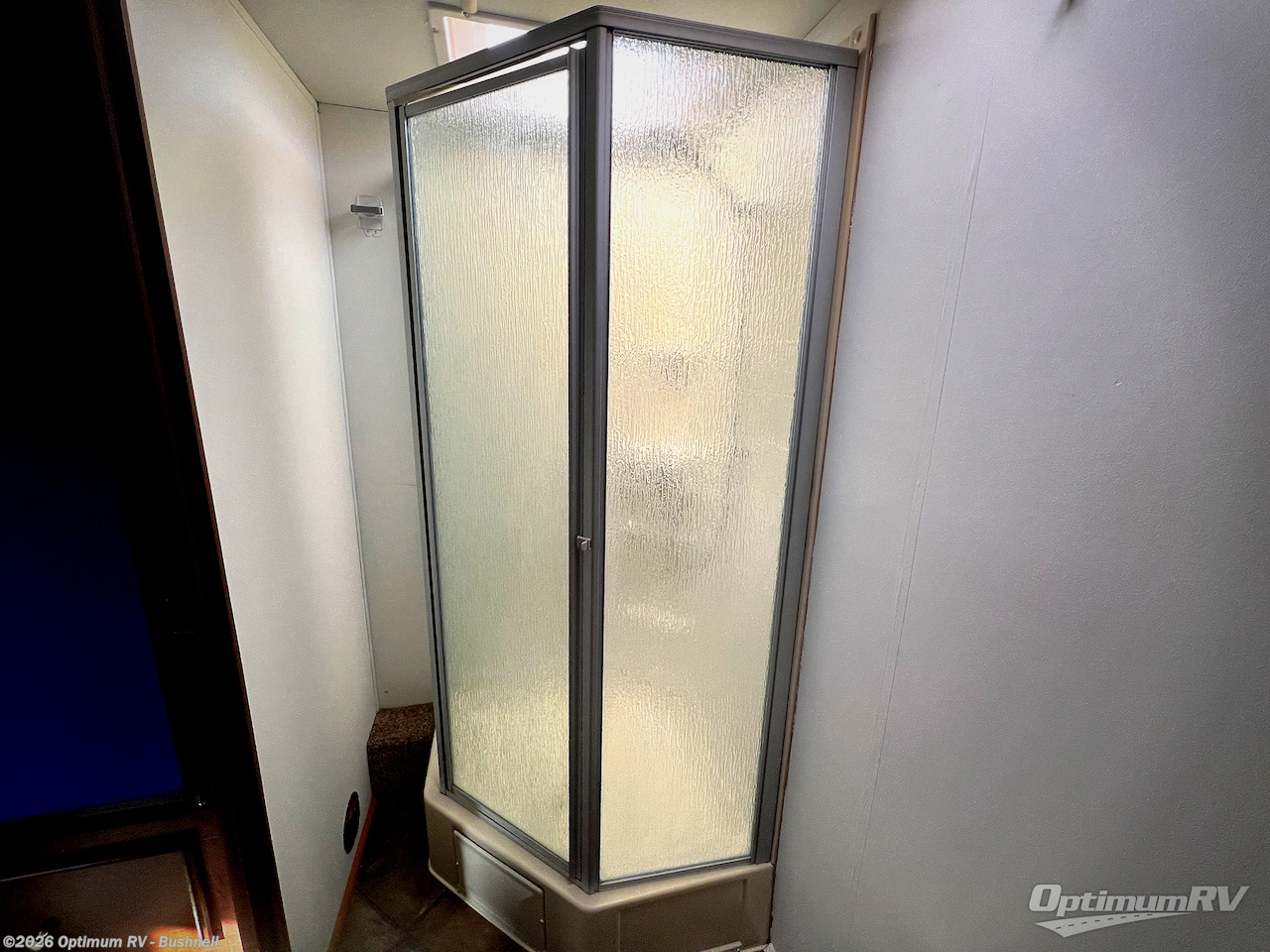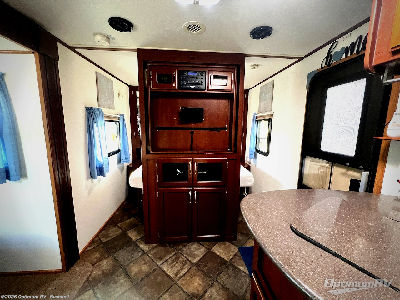 You will find plenty of overhead cabinets throughout the trailer as well as a large exterior pass thru storage area. In the rear of the trailer there is an outside shower.