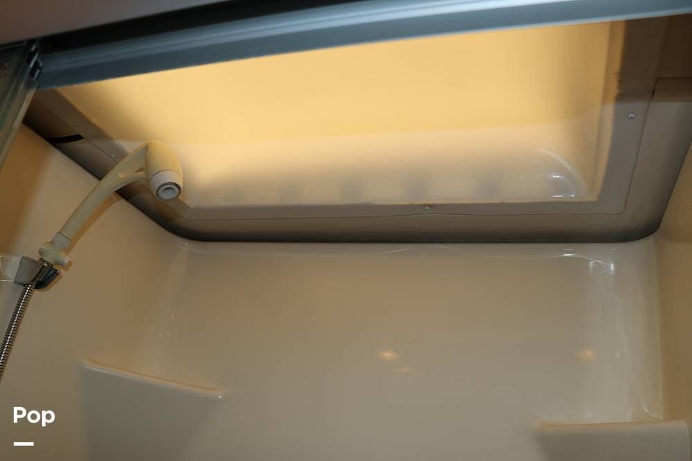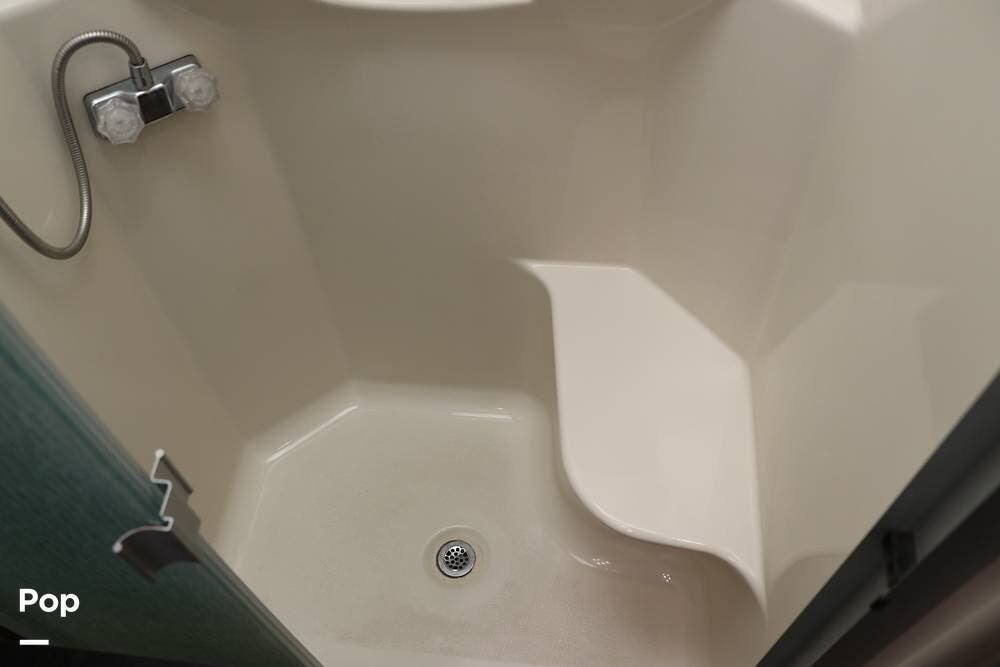 The full-width bathroom includes a shower with a skylight overhead for lots of natural light, an oval sink, a medicine cabinet above, and additional storage below the countertop - and across the hallway, the toilet with a second sink, and more cabinet space. The large corner shower with a seat in the corner provides a touch of luxury when camping. The doors can close to both the living area and the master bedroom to create a full-width bathroom.