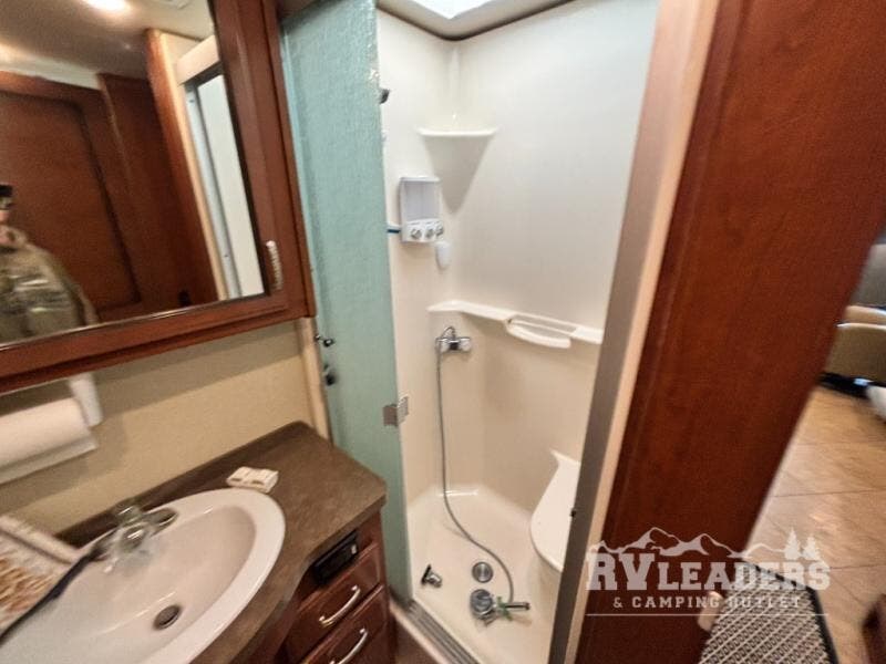 Proceeding toward the rear of the motor home you will find a private toilet area with a sink. On the opposite side of the motor home there is a shower and sink.