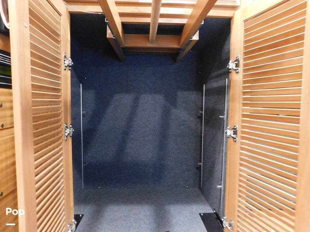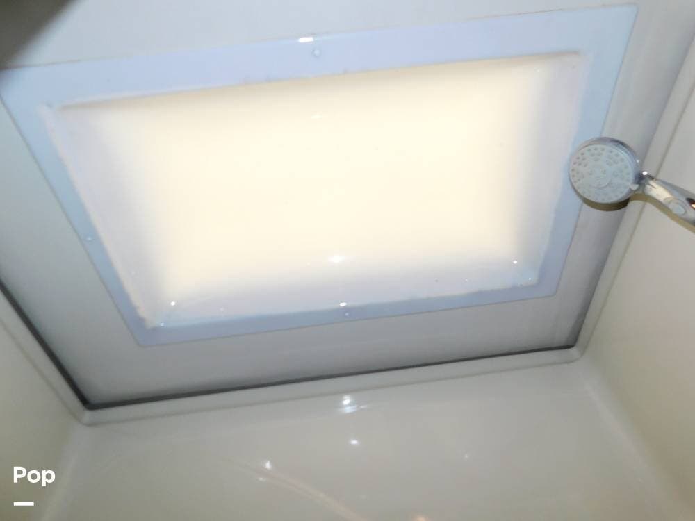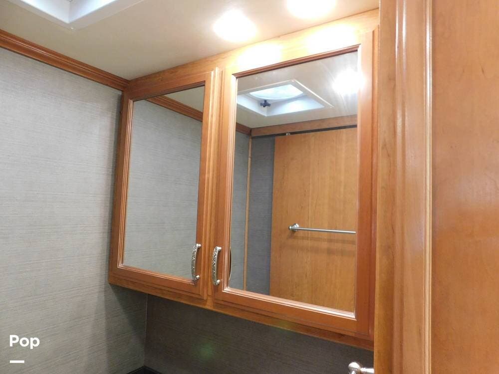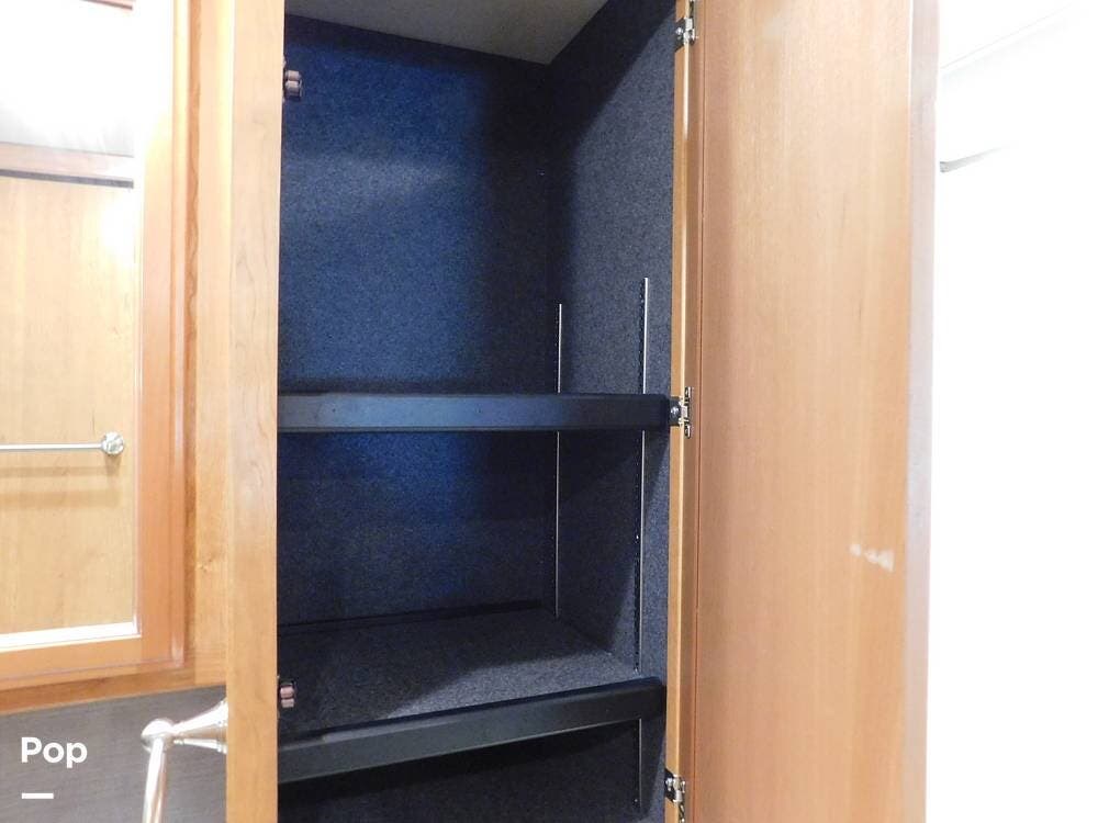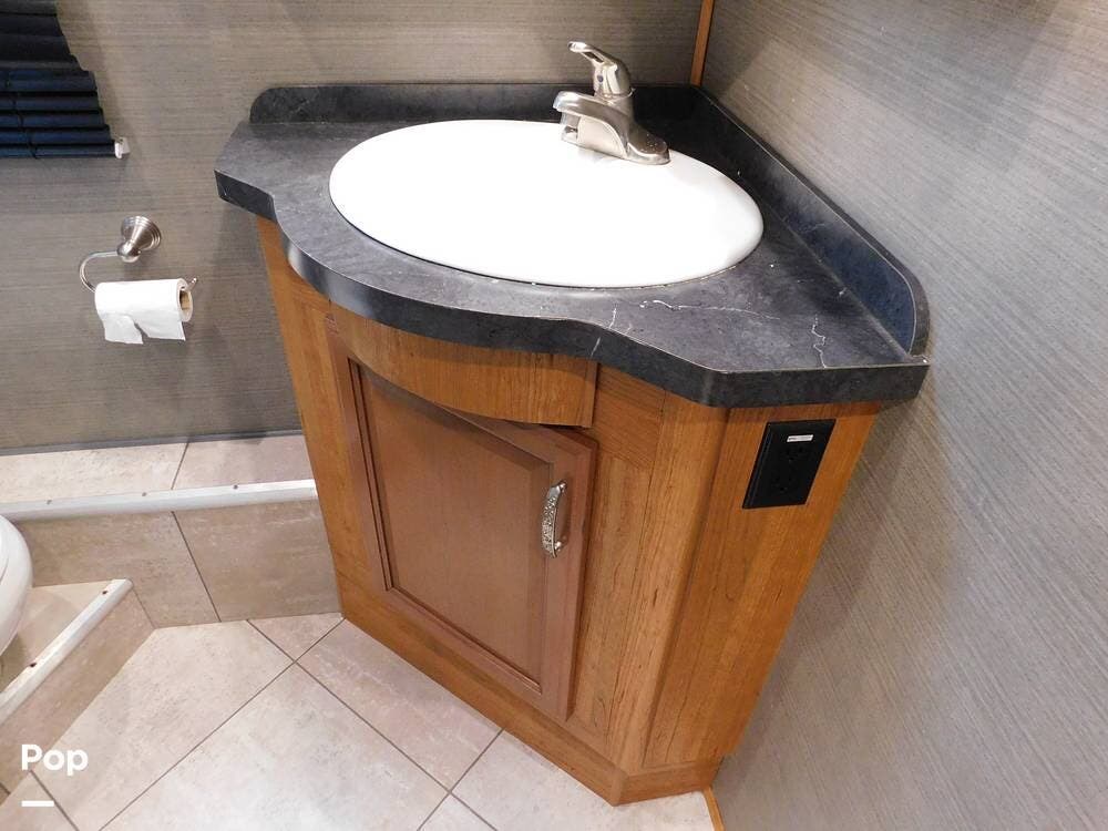 One of the standout features of the 35K is its bath-and-a-half layout. The main bathroom, located at the rear, offers a spacious shower with glass doors, a porcelain toilet, a vanity with a sink, and ample storage for toiletries and towels. The half-bath, conveniently situated mid-coach, provides a second toilet and sink, making it ideal for guests and easy access while traveling.