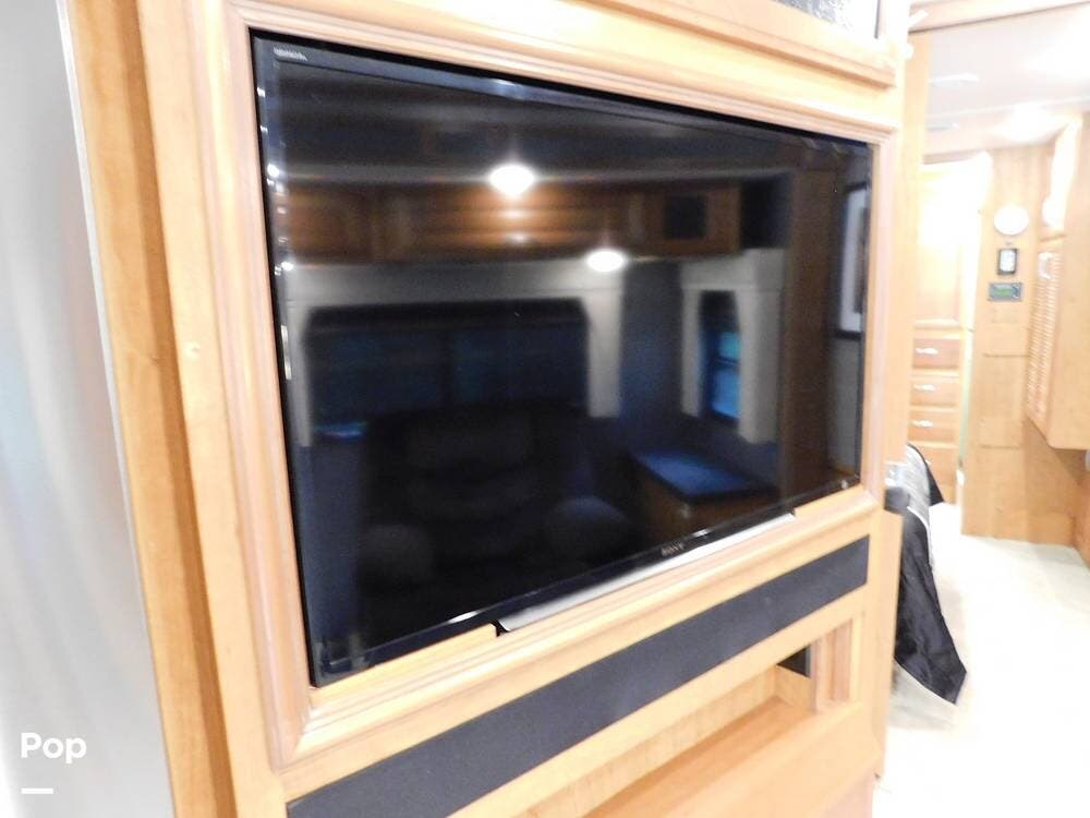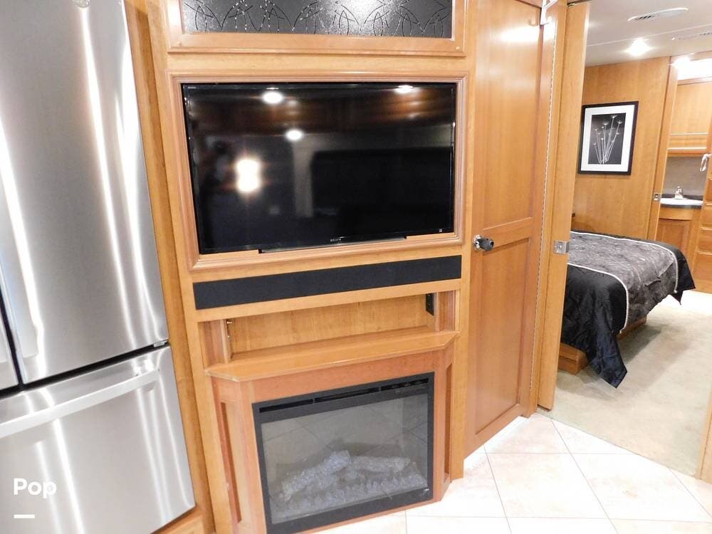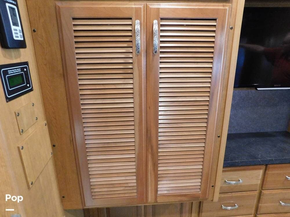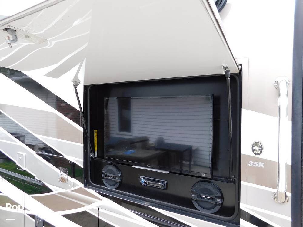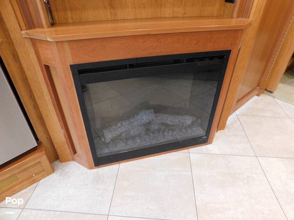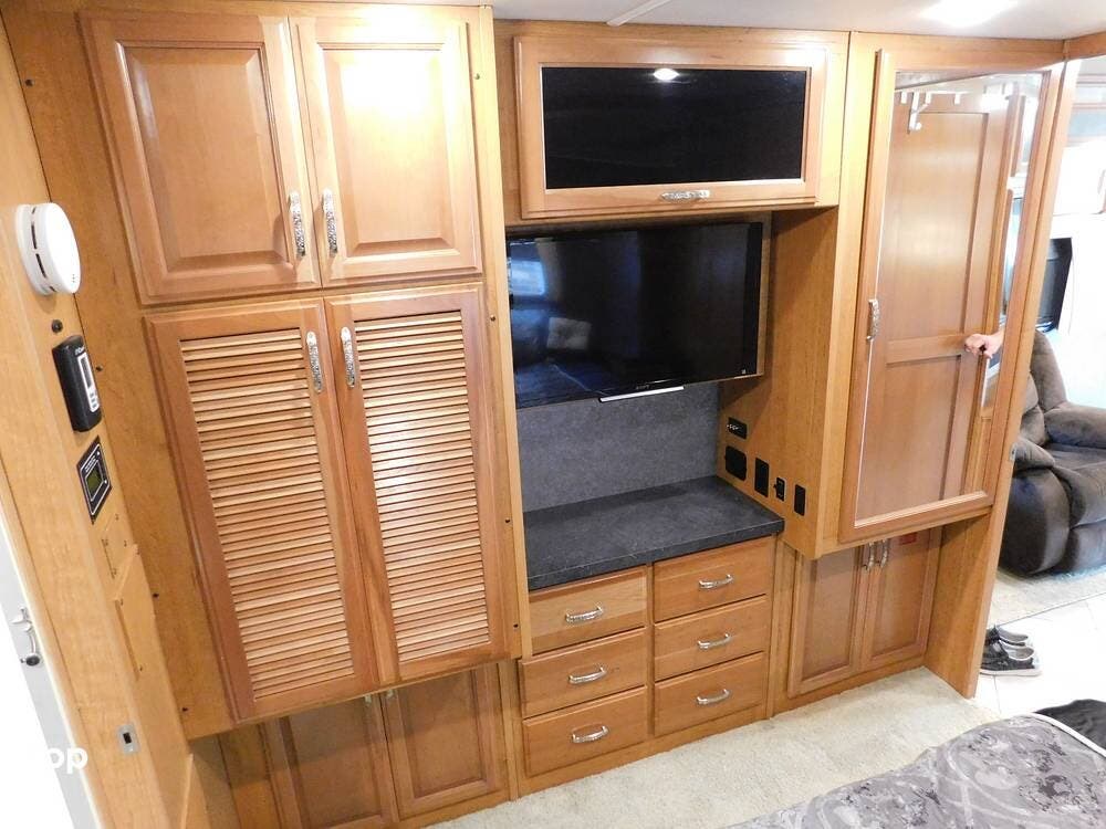 For entertainment, the Bounder 35K features multiple flat-screen TVs, including one in the living area with a cozy fireplace beneath, another in the bedroom, and an exterior TV for outdoor viewing. The RV is pre-wired for satellite and cable, and offers surround sound speakers for a theater-like experience. Climate control is managed by dual air conditioning units and a powerful furnace, ensuring comfort in both hot and cold weather.