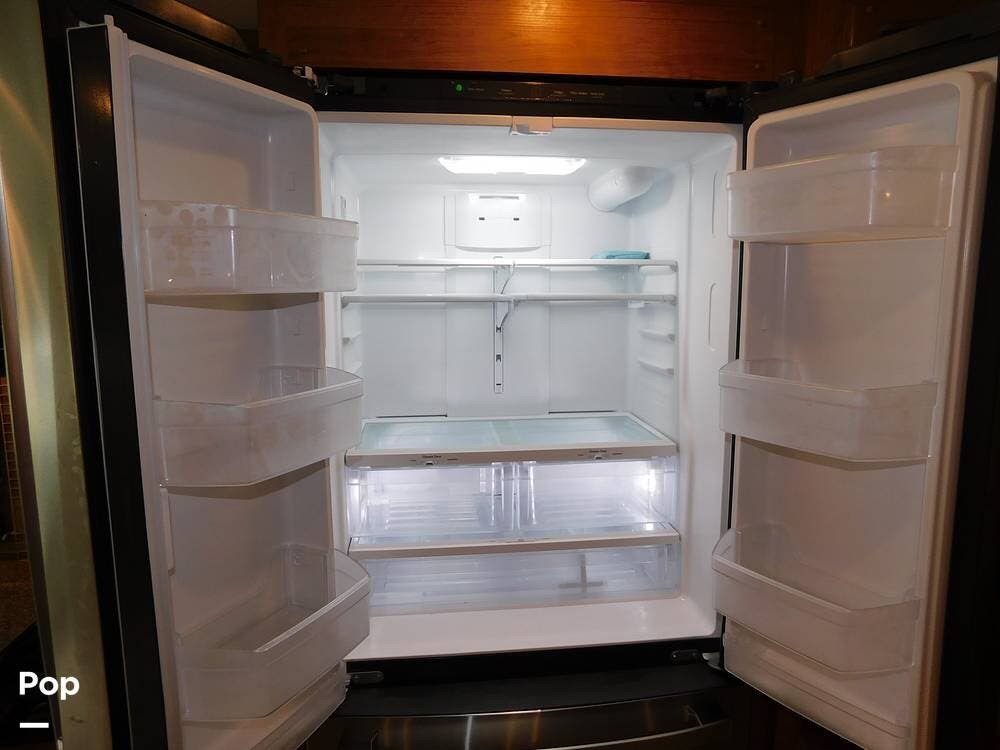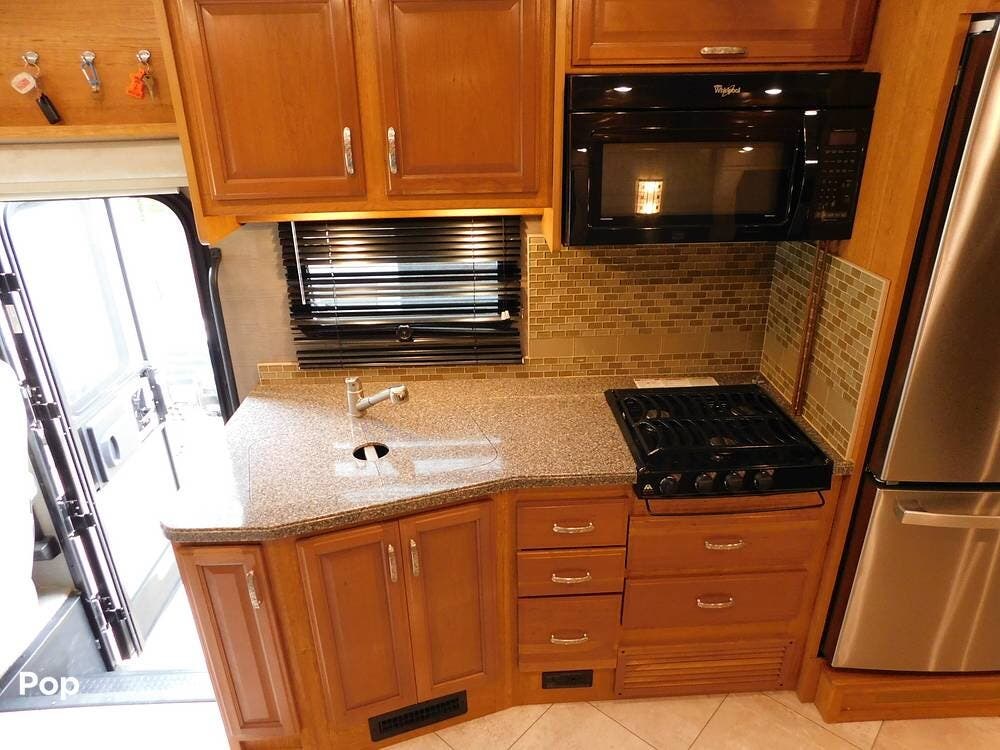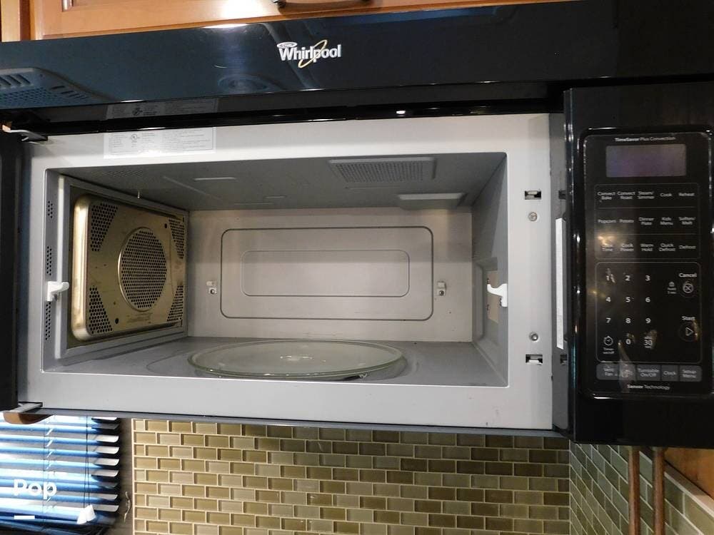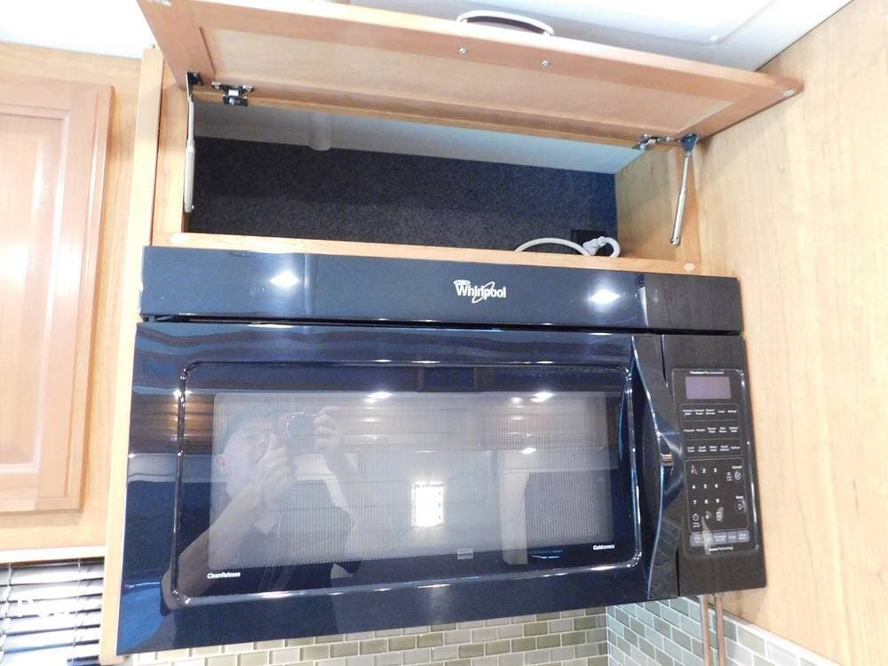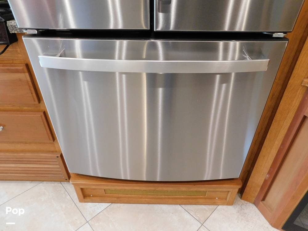 The kitchen is equipped with solid-surface countertops, an updated residential-size refrigerator, a three-burner stove, a convection microwave, and plenty of cabinetry for storage. The interior decor is elegant, with high-quality fixtures, soft-touch vinyl ceilings, and wood cabinetry that adds warmth and sophistication.