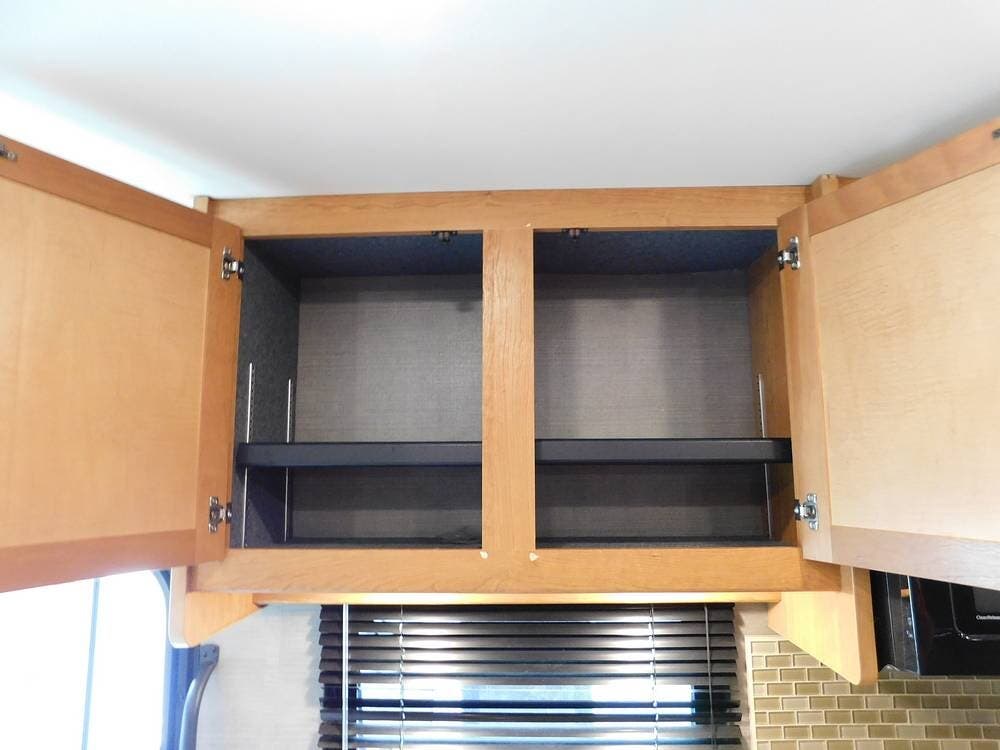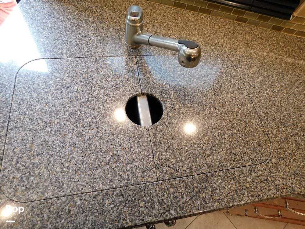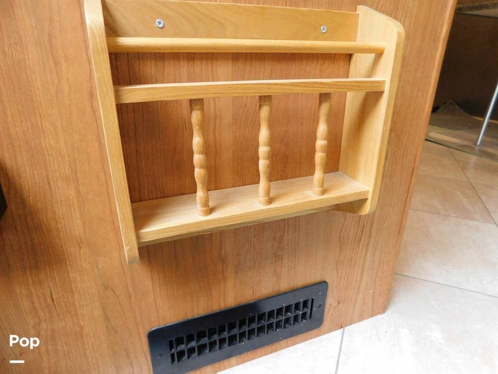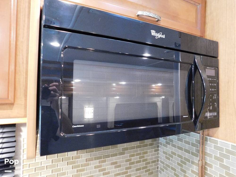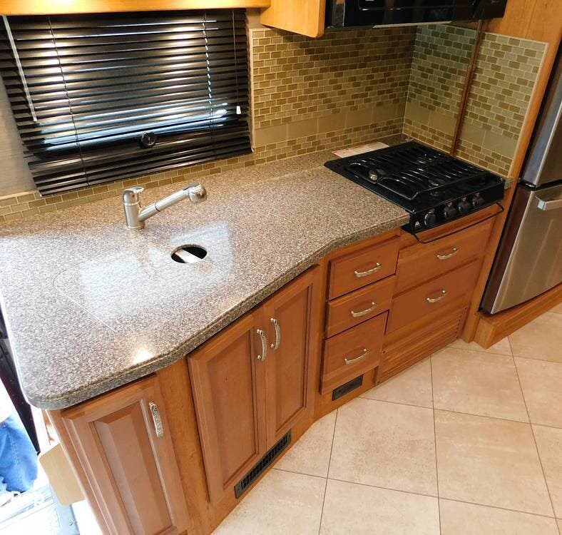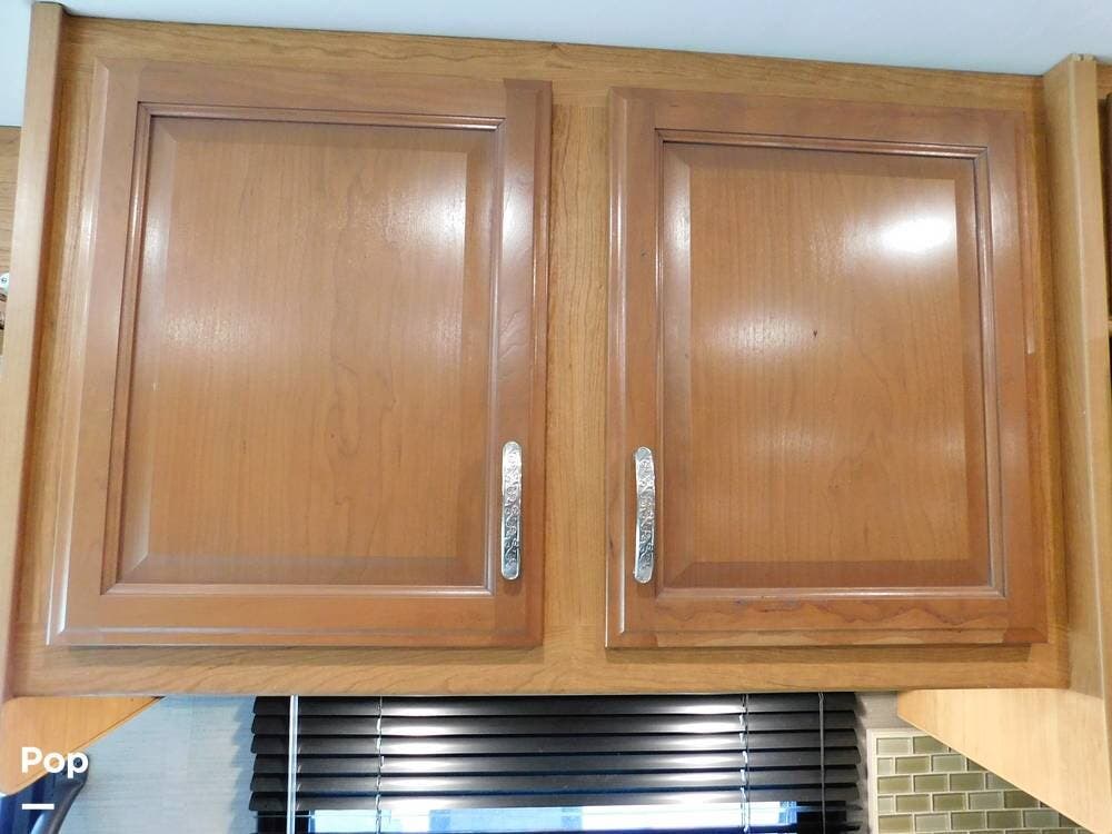 The kitchen is equipped with solid-surface countertops, an updated residential-size refrigerator, a three-burner stove, a convection microwave, and plenty of cabinetry for storage. The interior decor is elegant, with high-quality fixtures, soft-touch vinyl ceilings, and wood cabinetry that adds warmth and sophistication.