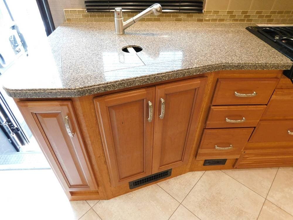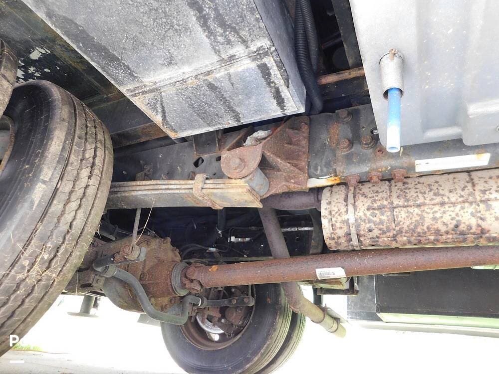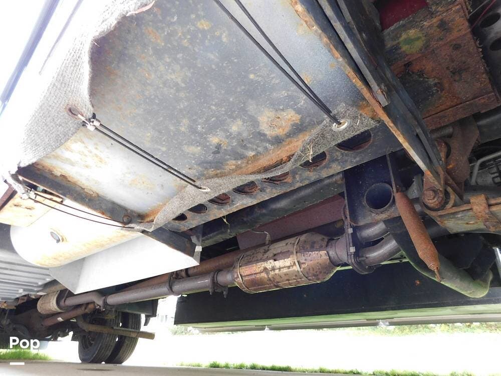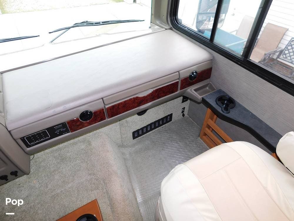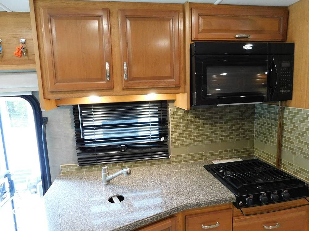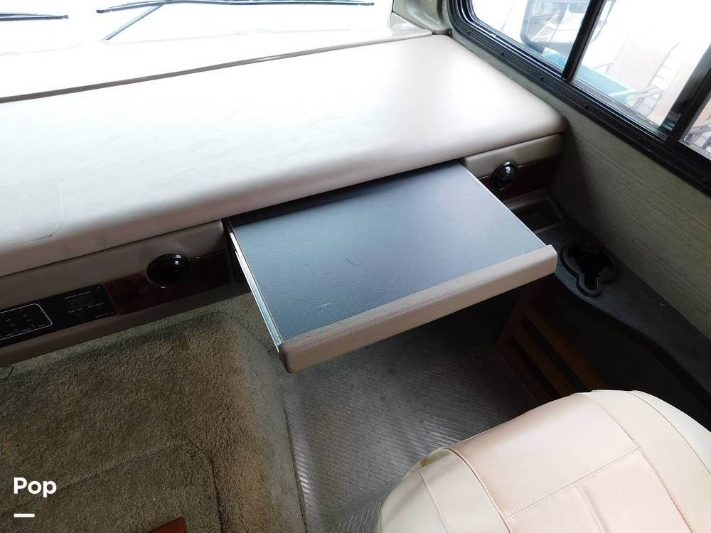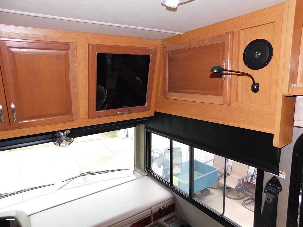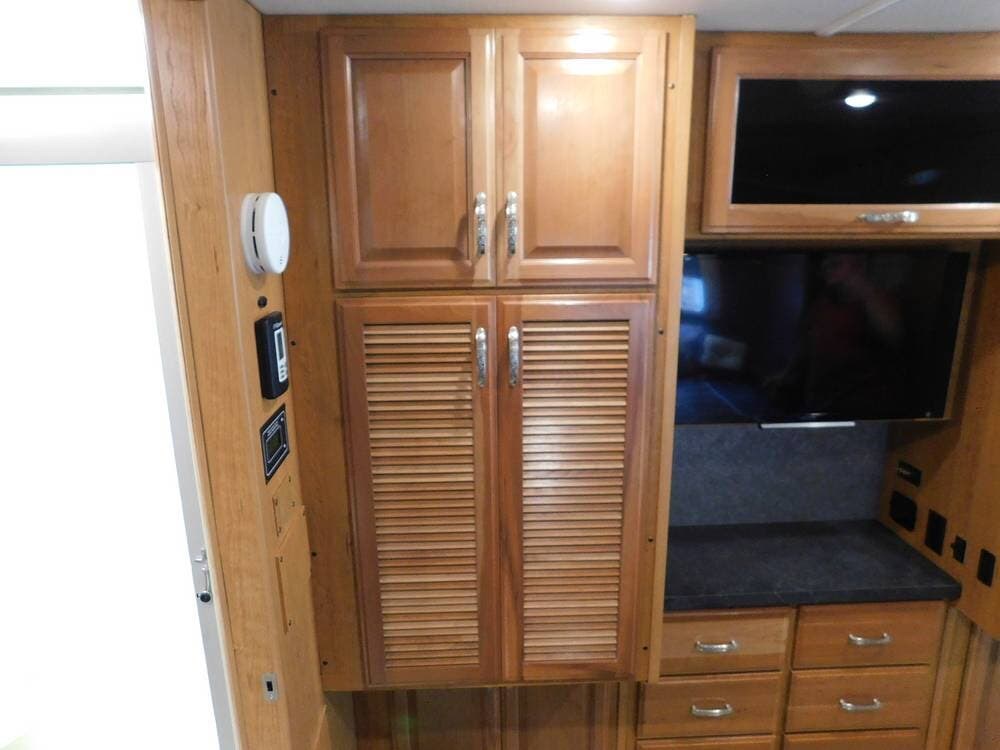 Inside, the Bounder 35K impresses with a spacious floor plan. The dual slide-outs expand the living area. The seller has the original L-shaped sleeper sofa in good condition, and the dinette that has standard Ultraleather wear. Or fill this space with whatever furniture your heart desires, as this seller did.
