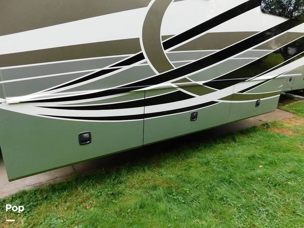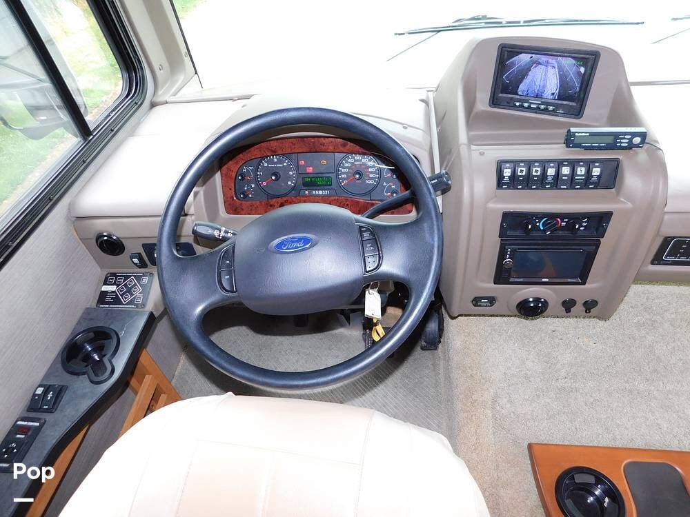 Measuring approximately 36 feet in length, this RV is built on a sturdy Ford chassis and powered by a reliable 6.8L Triton V10 gasoline engine, offering ample horsepower for highway cruising and mountain adventures alike.