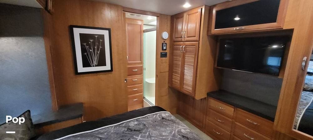 The bedroom boasts a queen-size bed with underbed storage, overhead storage, wardrobes, and a dedicated entertainment system. Nightstands flank the bed, and there is plenty of room to walk around.