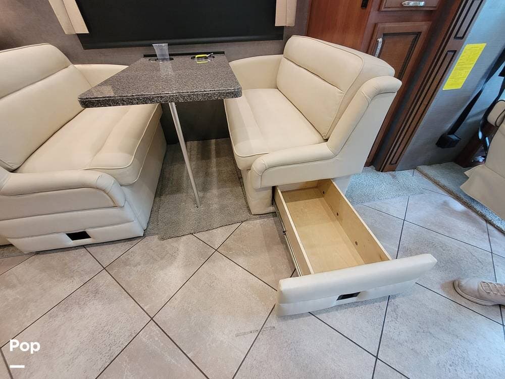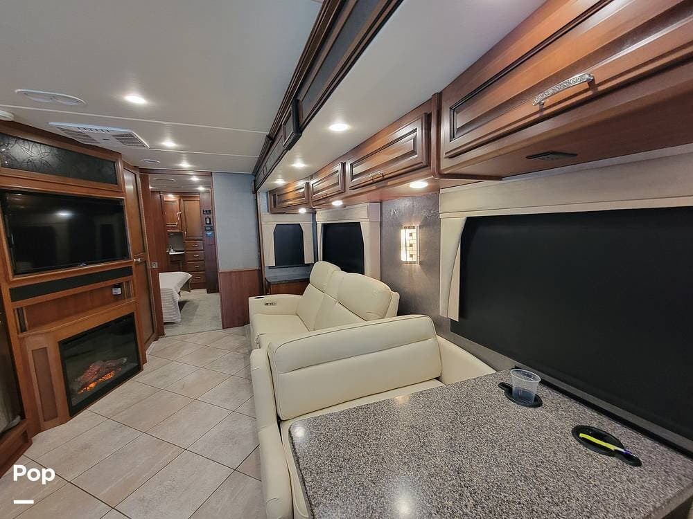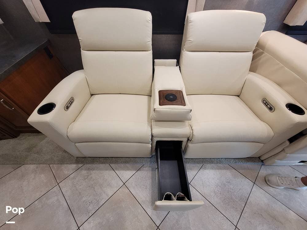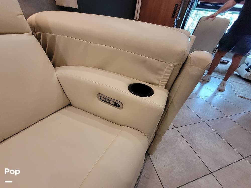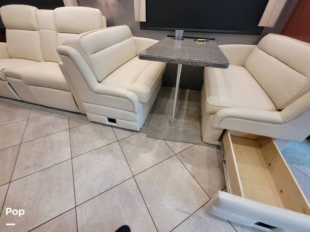 The 35K has a nice layout for long-term travel or living. The cushions have been covered in a bright white color. The dinette drops down to make a bed. The power-reclining seats face the cozy fireplace and TV.