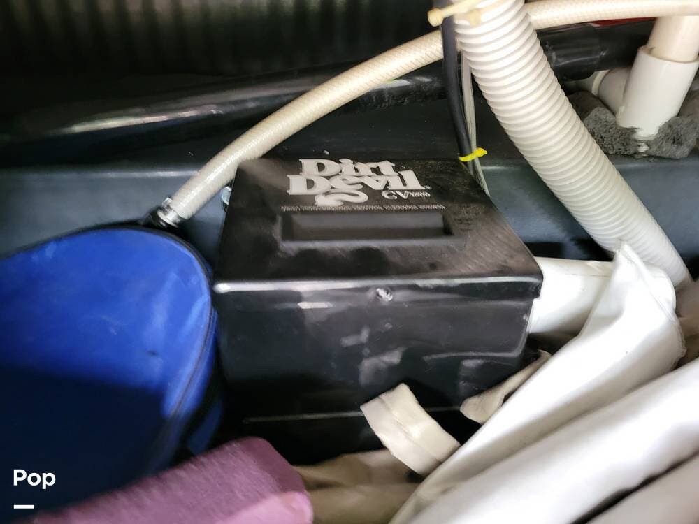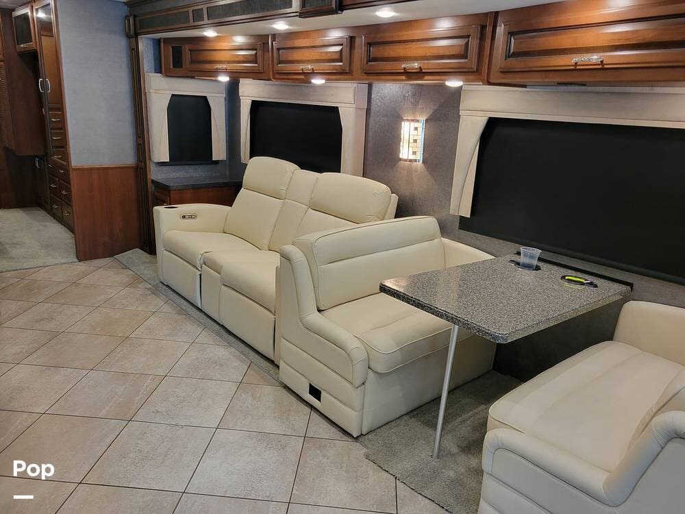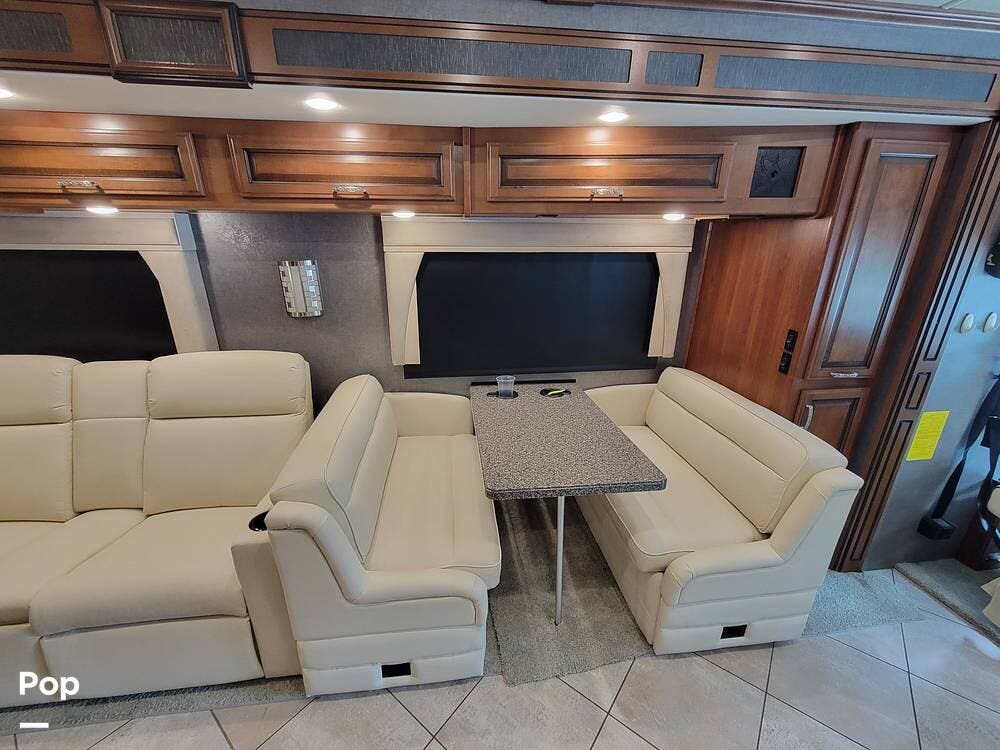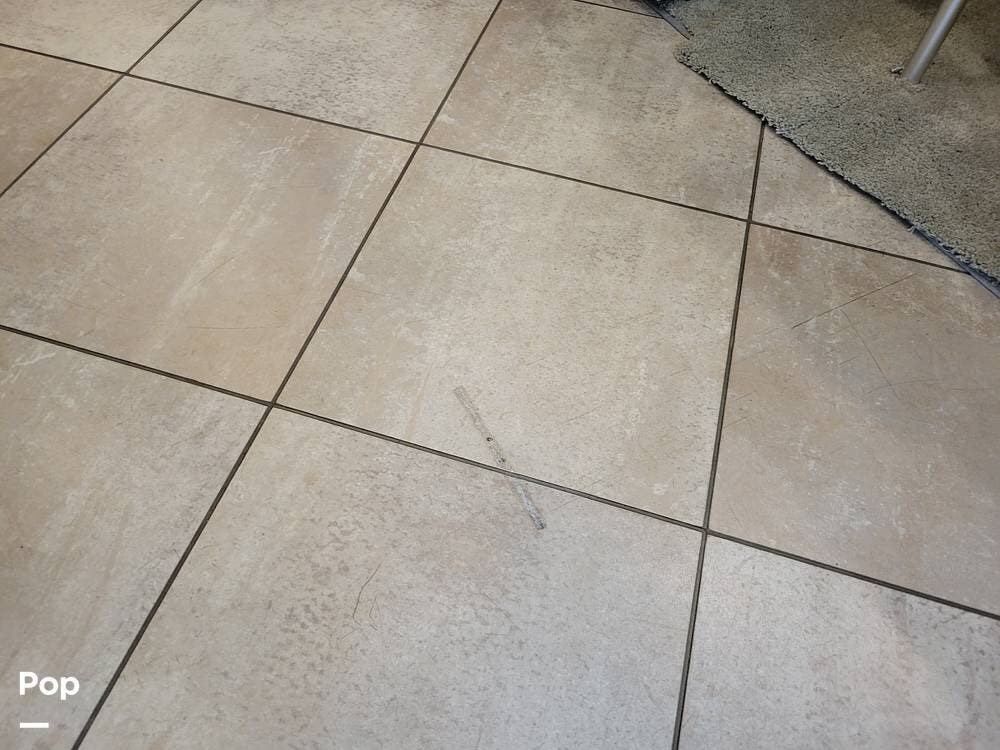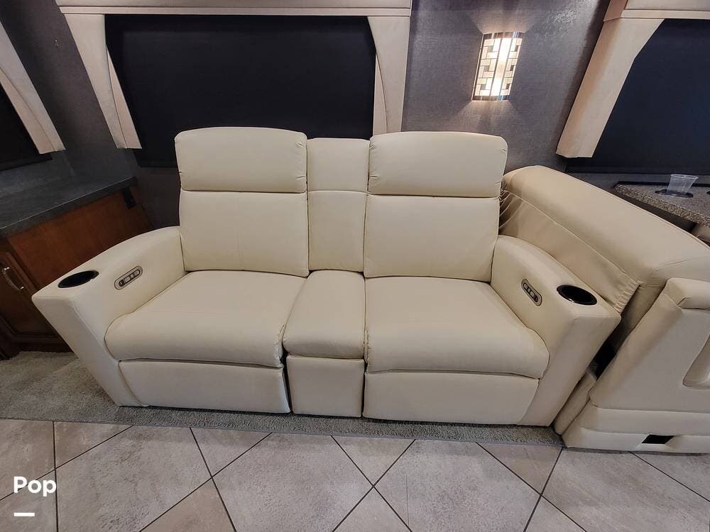 The 35K has a nice layout for long-term travel or living. The cushions have been covered in a bright white color. The dinette drops down to make a bed. The power-reclining seats face the cozy fireplace and TV.