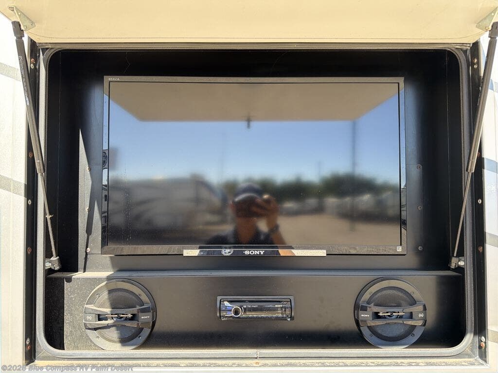 The front kitchen area has a 40" LED TV, double kitchen sink, three burner range, microwave, and refrigerator slide.