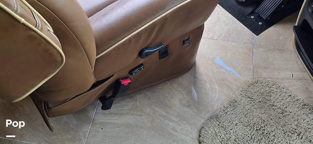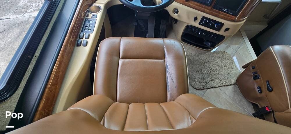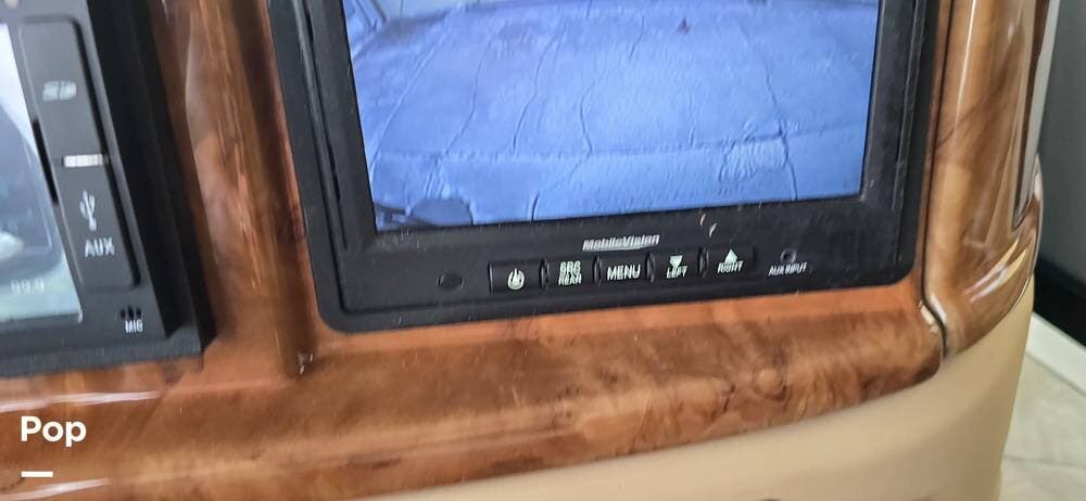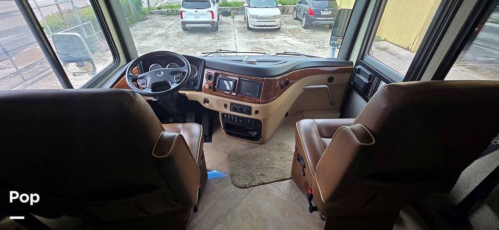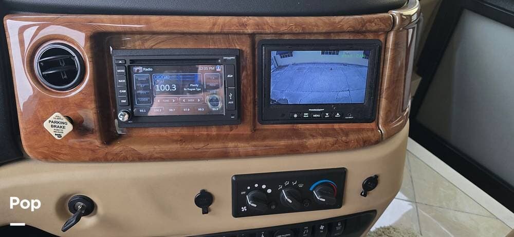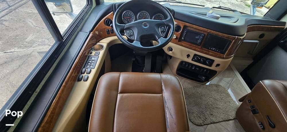 The cockpit is driver-centric and well-appointed, featuring deluxe soft-touch captain's chairs with power controls and footrests, a tilt/telescoping smart steering wheel, a touchscreen dash radio with AM/FM/CD/GPS, and side-view cameras viewed through the MobileVision Monitor. The remote chrome exterior mirrors house your cameras. A thoughtful layout ensures every control and monitor is within reach.