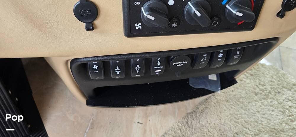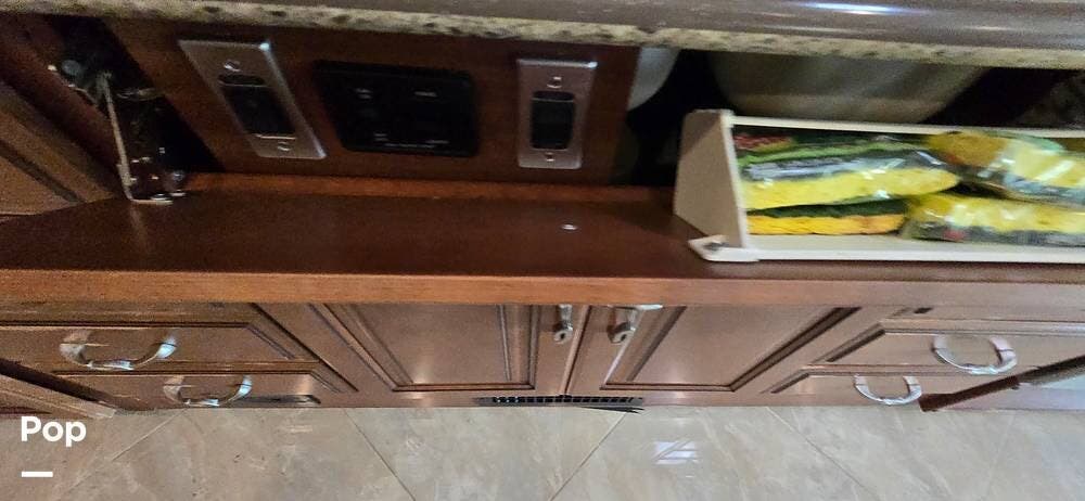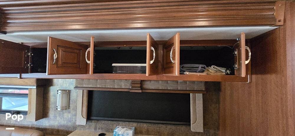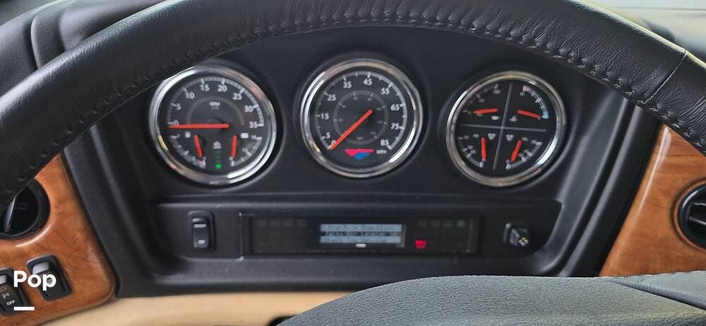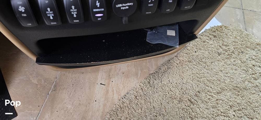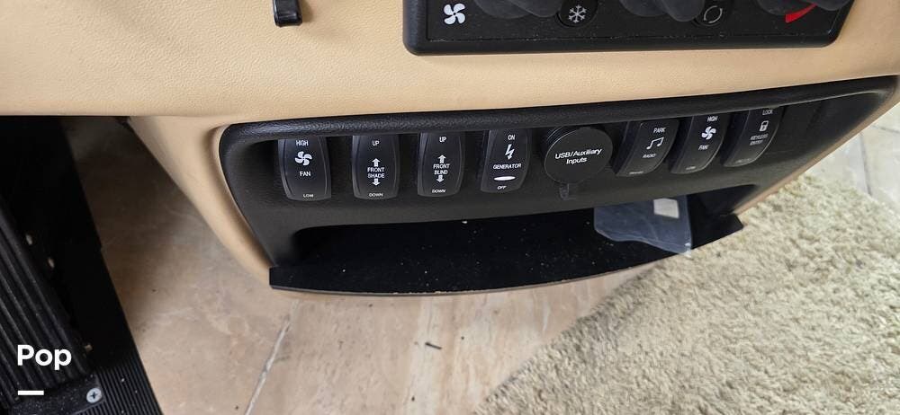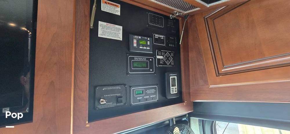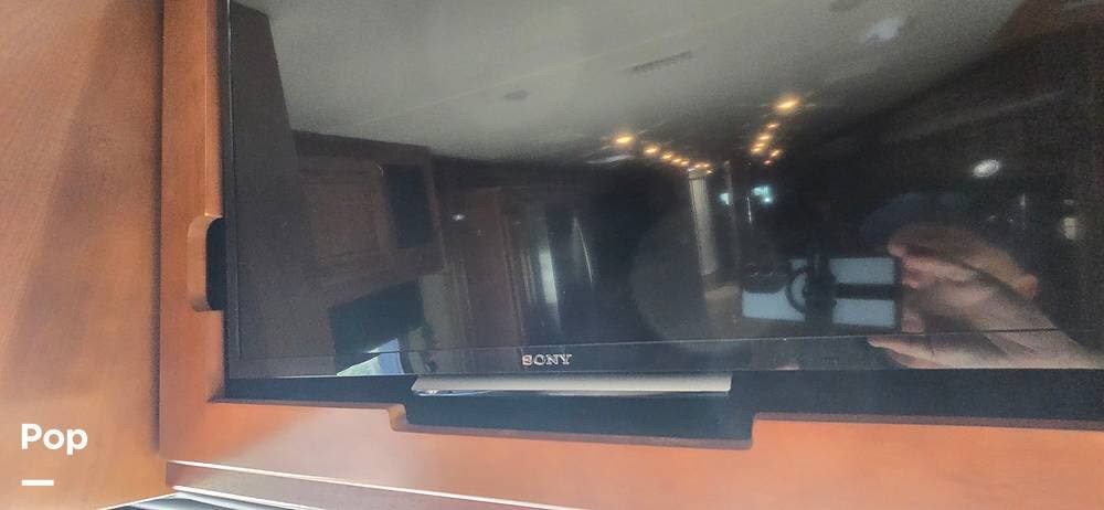 Overhead, the cockpit has matching cabinetry for added storage as well as a 32" Sony LED TV, and to the passenger side are the central controls.