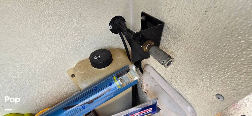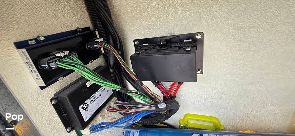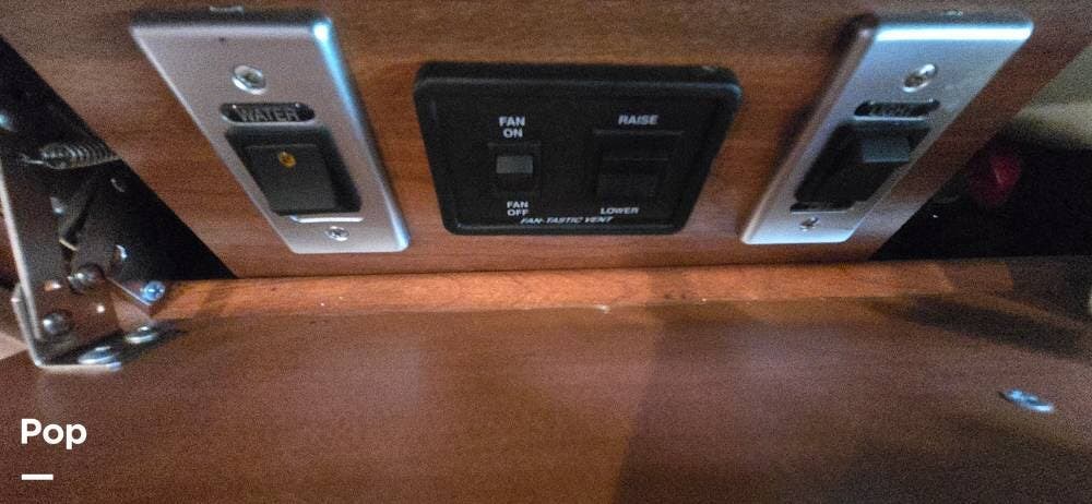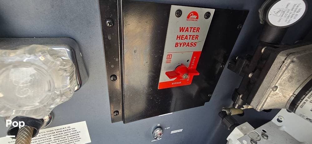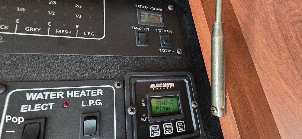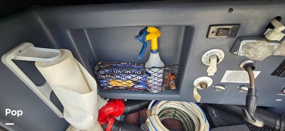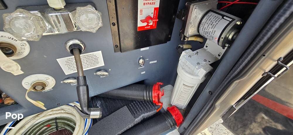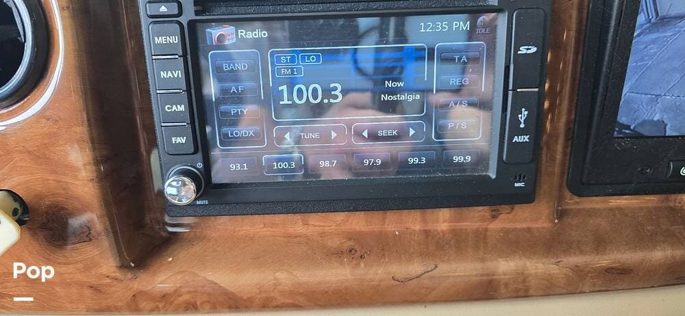 Overhead, the cockpit has matching cabinetry for added storage as well as a 32" Sony LED TV, and to the passenger side are the central controls.