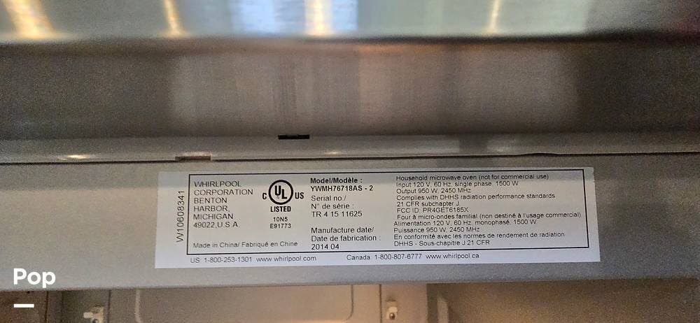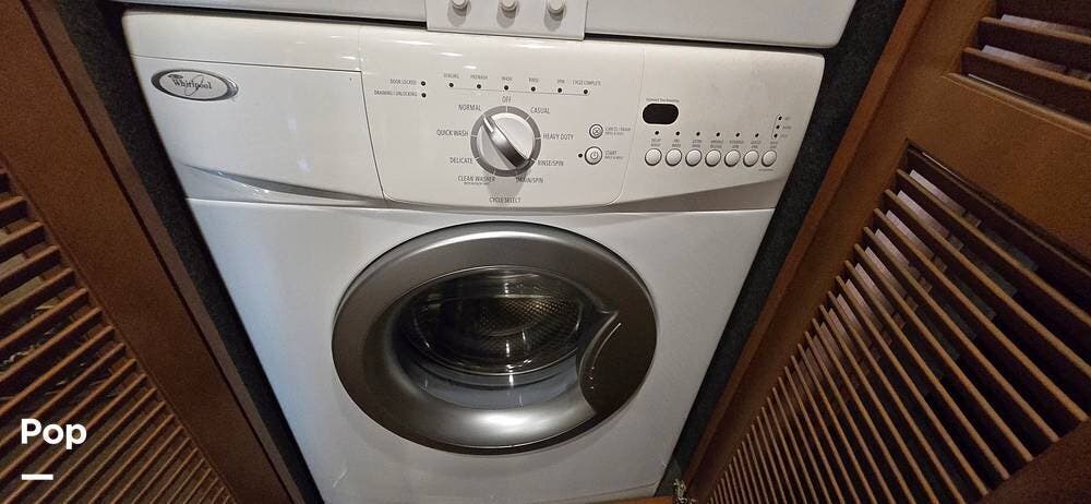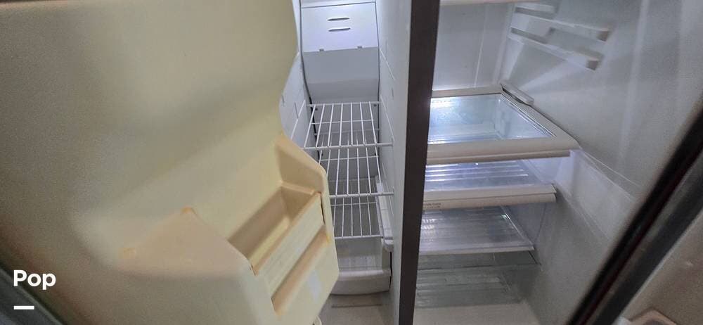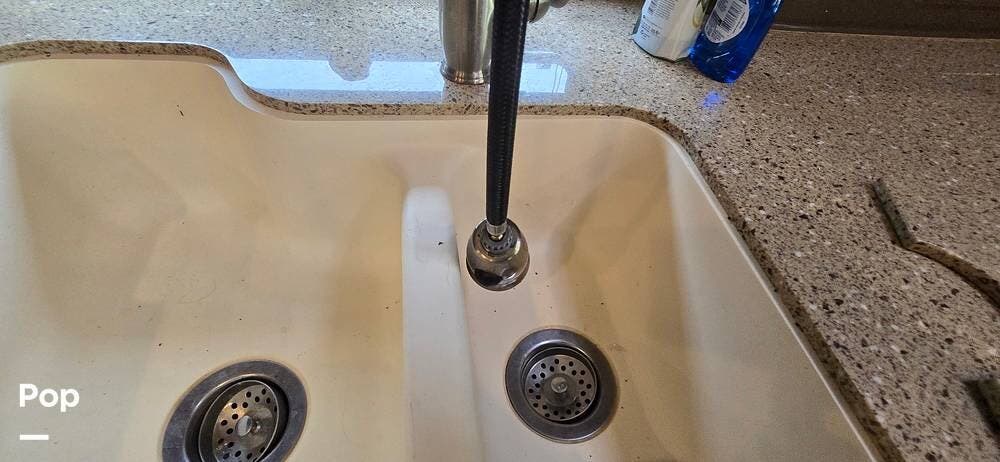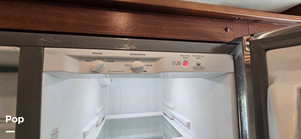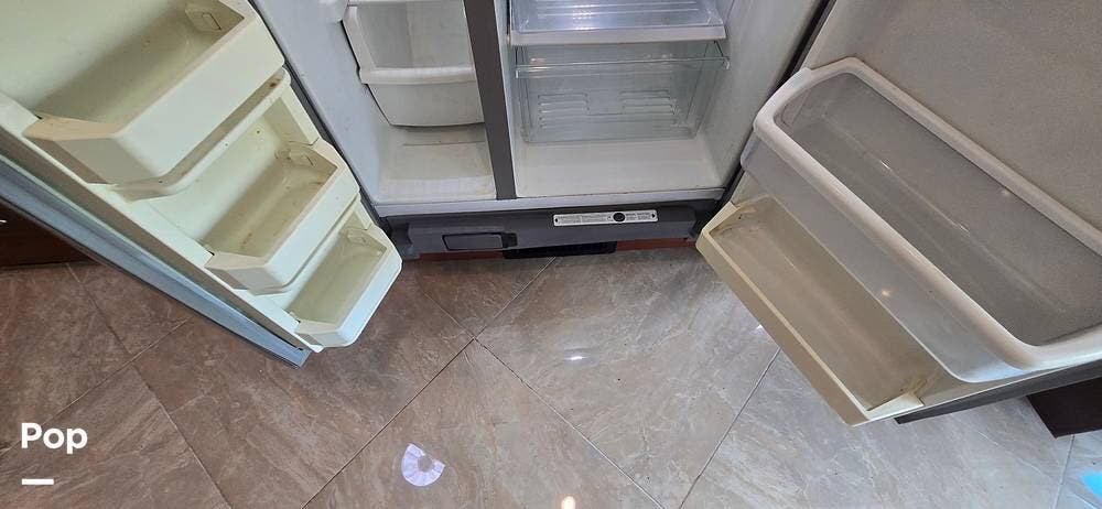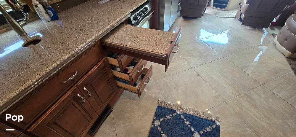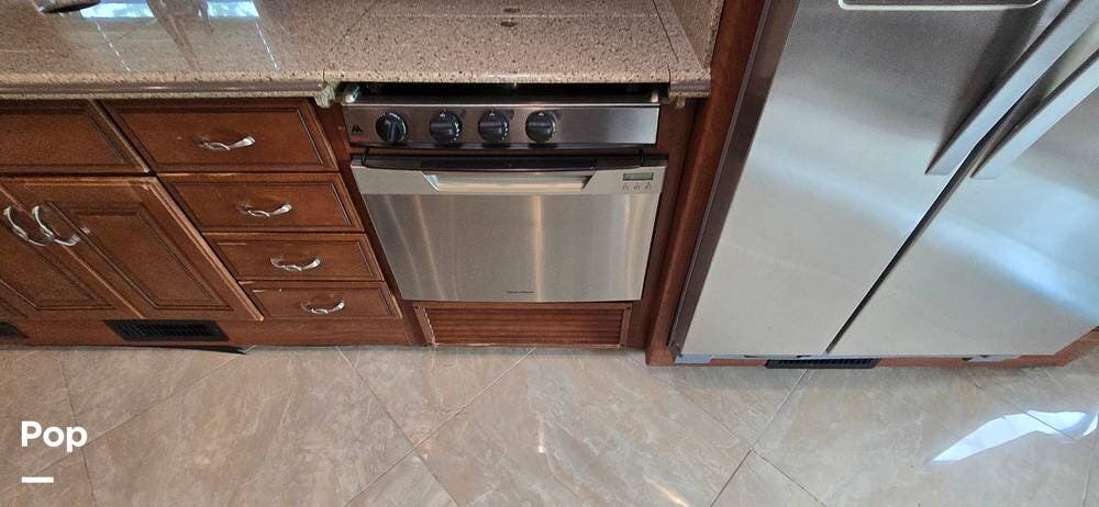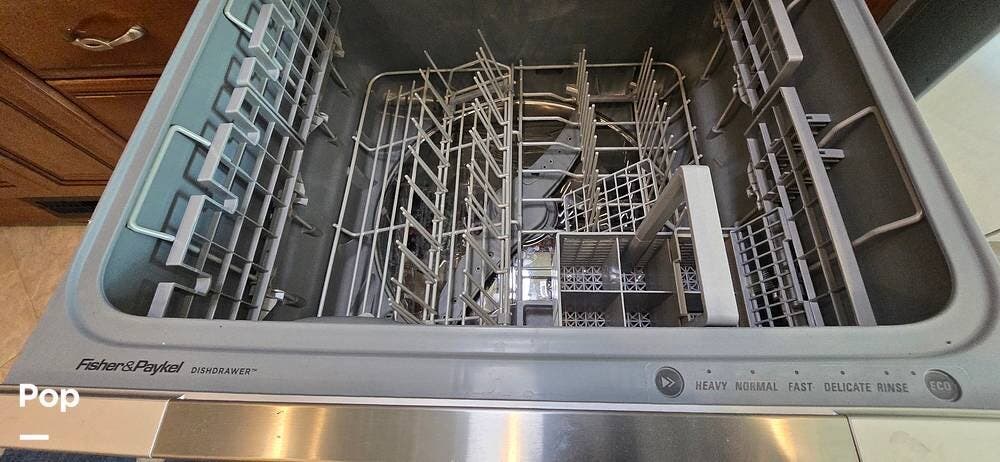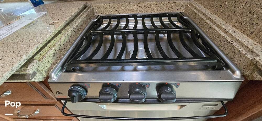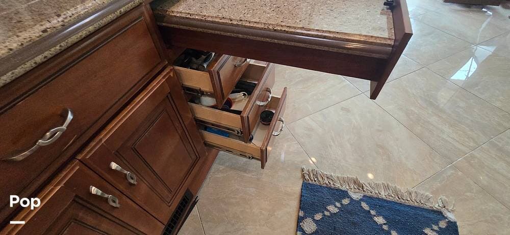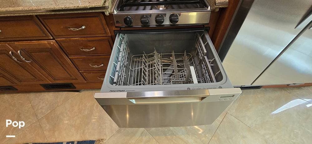 The galley features a French door 22 cu/ft. Whirlpool refrigerator with water and ice dispenser, an Atwood 3-burner gas range, a Fisher & Paykel dishwasher, a 1,500-watt Whirlpool convection/microwave, a pull-out counter extension, and a dual stainless sink with a gooseneck sprayer.