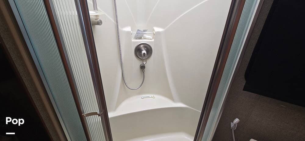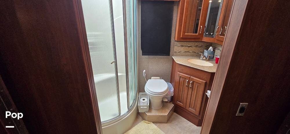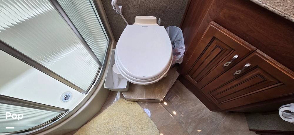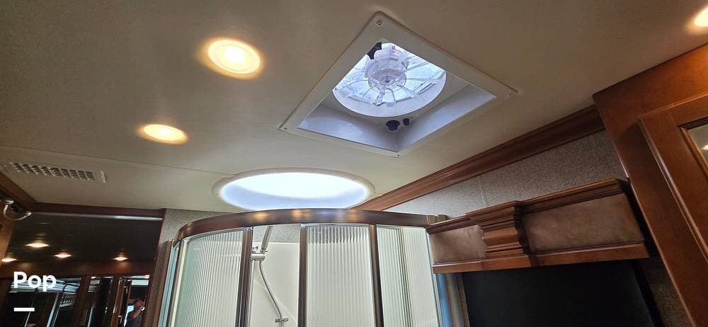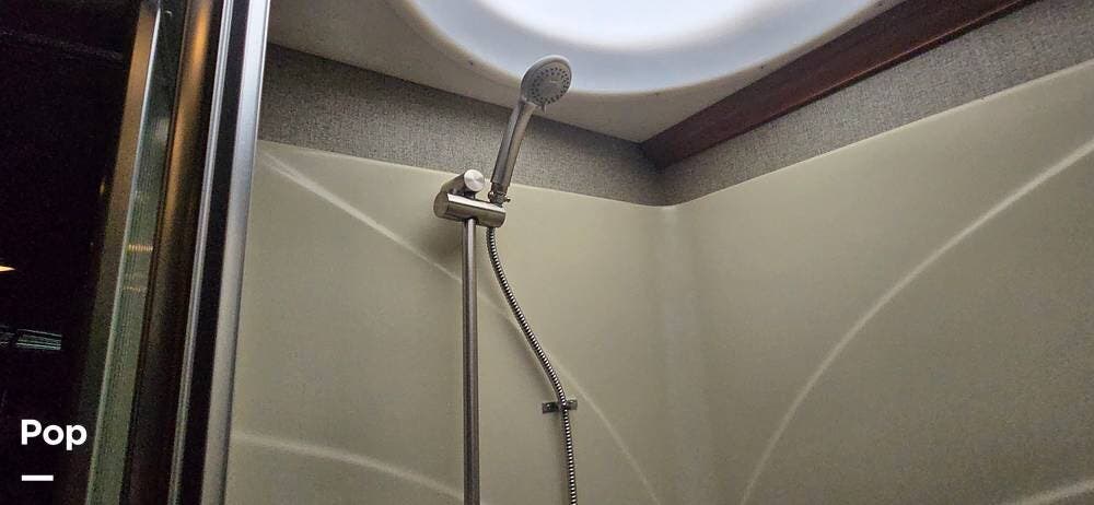 The mid-coach bathroom features a large, glass-enclosed shower with a skylight, a porcelain toilet, a vanity with a sink, and ample storage for linens. Positioned mid-ship, it is easily accessible from both the living area, the bunk area, and the master suite.