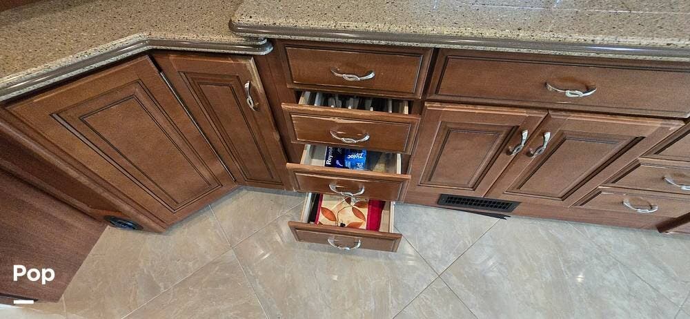 Step inside and experience the elegance of the Discovery's interior decor in Autumn Pecan hues, paired with Spice cabinetry--creating a warm and inviting setting. The coach offers high-gloss 24"x24" porcelain tile flooring, solid-surface countertops, and hardwood cabinet doors with double roller shades throughout.