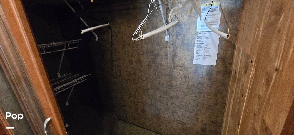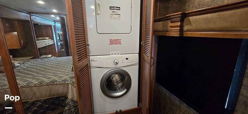 At the rear, the master suite is a private retreat featuring a king-size air mattress bed with adjustable firmness settings, dual nightstands, overhead cabinetry, and a full wardrobe with cedar lining. Additional touches include a 32" LED TV and stackable washer/dryer prep, making extended travel both comfortable and convenient.