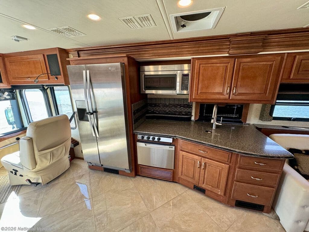 Stepping inside the Discovery 40X motor home by Fleetwood, you will be impressed with how spacious it feels. As you enter on the left is a refrigerator, three burner range, microwave, double kitchen sink, sofa and end table slide. The opposite side of the motor home has a free-standing dinette and j-sofa slide. You can enjoy watching TV on the 48" LED TV.