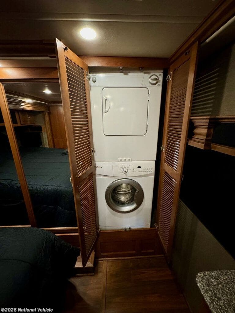The bedroom is in the rear of the motor home, and has a king bed. There is plenty of space with the wardrobe and stackable washer and dryer. You can enjoy watching tv on the 32" LED TV in the bedroom.