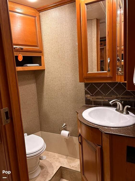 The half bathroom has a vanity sink with mirrored cabinets, an exhaust fan, and a toilet with a privacy door.