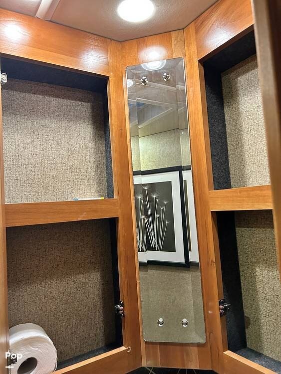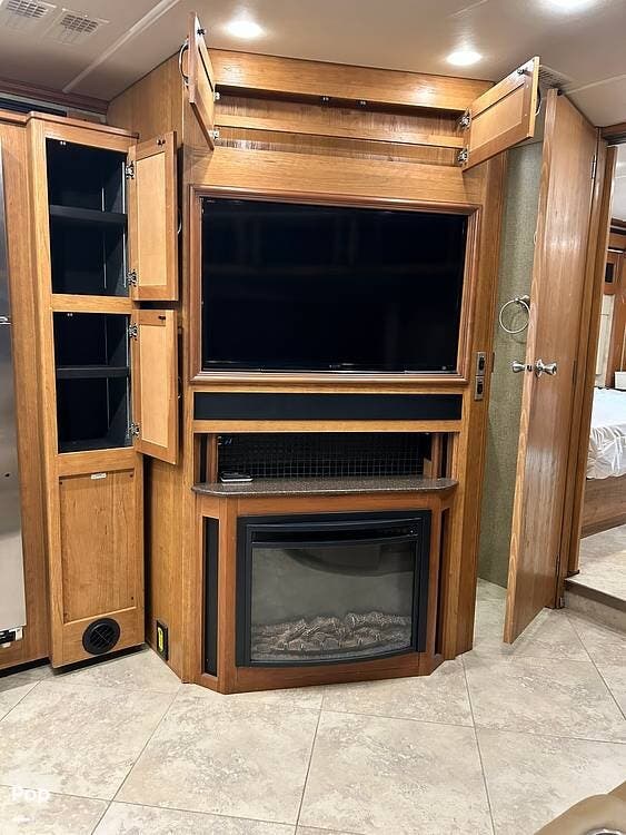 The living area has stadium-style recliners with a perfect view of the huge HDTV and the fireplace. The entertainment center also has a CD player and surround sound. There is plenty of real wood cabinetry and trim throughout the couch.